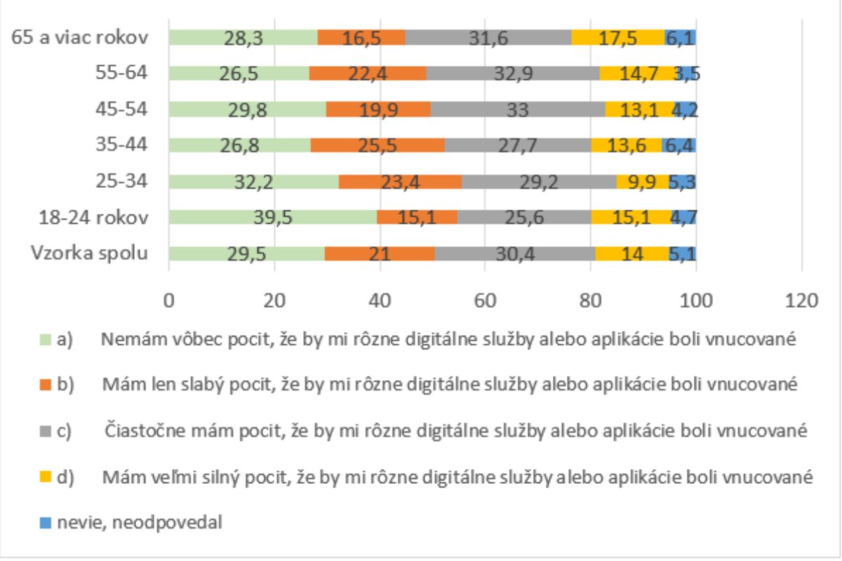 Pri vyjadrení pocitu, že sú im digitálne služby vnucované, je vidieť, že najmenší podiel je vyhranene negatívnych odpovedí, teda tých, ktorí majú silný pocit vnucovania digitálnych služieb. „Tu je vidieť zároveň podobnosť najmladšej vekovej skupiny a dvoch najstarších vekových skupín. Dá sa predpokladať, že práve v týchto dvoch vekových skupinách je zvýšený podiel ľudí vystavených zníženej možnosti ovplyvňovať svoj život a teda aj zvýšenej citlivosti na aktuálne opatrenia, nútiace v stále väčšej miere využívať rôzne digitálne technológie. Zároveň je vidieť najvyššiu rozšírenosť pocitu, že im digitálne služby nie sú vnucované práve medzi najmladšími, ktorá zažila socializáciu do prostredia nových technológii už v rámci školského systému,“ vysvetľuje výsledky Miroslav Tížik.