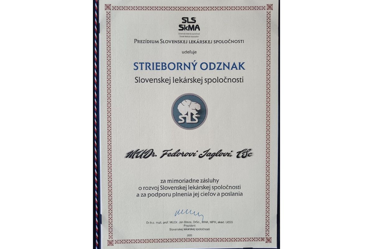 Na ostatnom zasadnutí výboru Slovenskej fyziologickej spoločnosti si cenu za mimoriadne zásluhy o rozvoj Slovenskej lekárskej spoločnosti (SLS) prebral náš dlhoročný kolega MUDr. Fedor Jagla, CSc. Strieborný odznak Strom života si prebral z rúk prezidentky Slovenskej fyziologickej spoločnosti profesorky MUDr. Andrey Čalkovskej, DrSc., a vedeckého sekretára profesora MUDr. Kamila Javorku, DrSc.