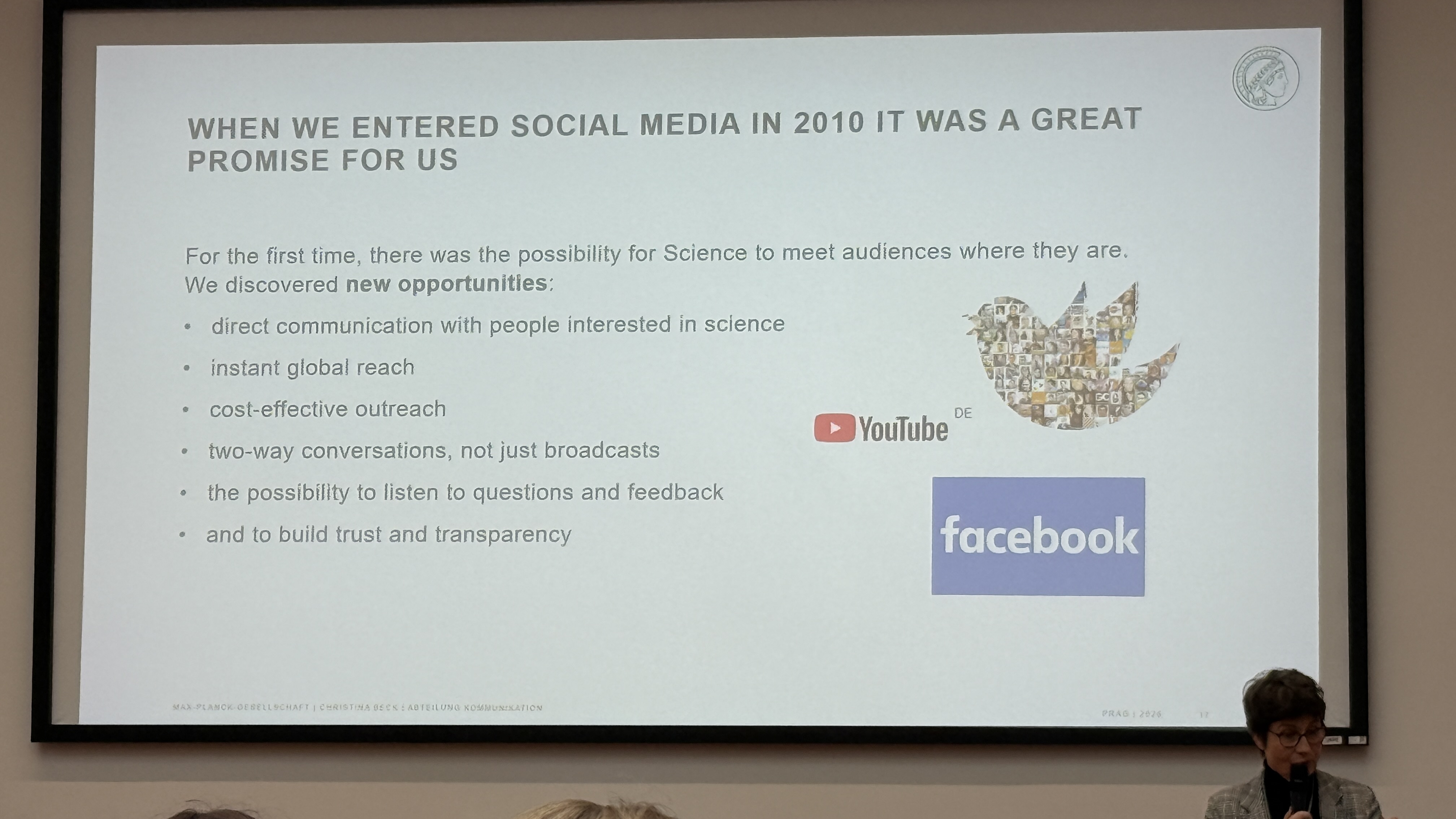 Dopoludňajšia časť programu patrila dvom hlavným prednáškam. V tej prvej sa predstavila Christina Beck, vedúca oddelenia komunikácie zo Spoločnosti Maxa Plancka, ktorá zodpovedá za vedeckú komunikáciu, public relations a korporátnu komunikáciu. Vo svojej prednáške s názvom „From Ivory Tower to Newsfeed: Rethinking the Functions of Science Communication“ poukázala na problémy, ktoré tvorcom obsahov spôsobujú algoritmy sociálnych sietí.