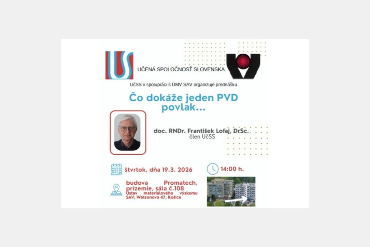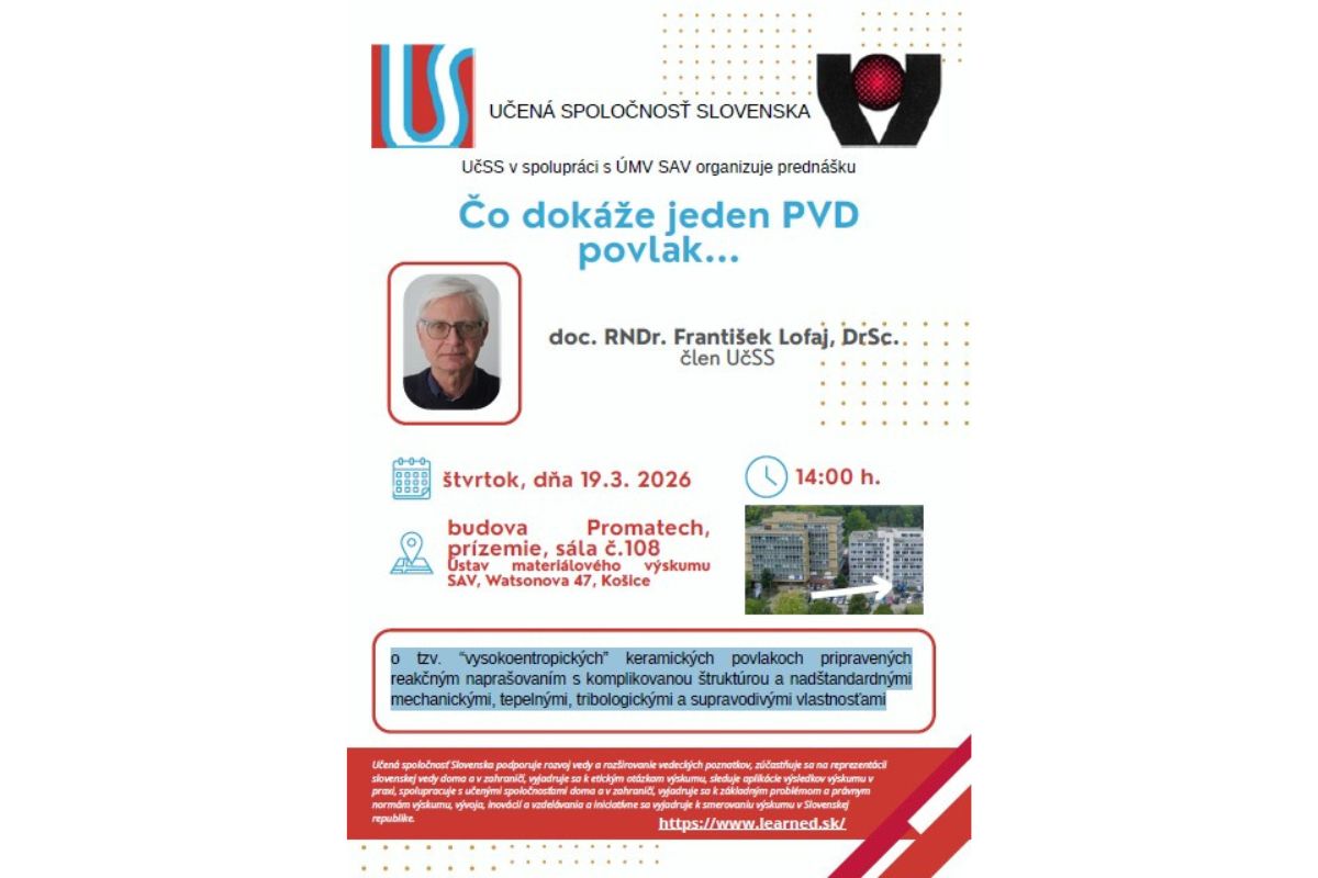 Učená spoločnosť Slovenska (UšSS) v spolupráci s Ústavom materiálového výskumu SAV. v. v. i., organizujú prednášku člena UčSS doc. RNDr. Františka Lofaja, DrSc., na tému Čo dokáže jeden PVD povlak... Podujatie sa koná vo štvrtok 19. marca 2026 o 14.00 hod. v budove Promatechu v sále č. 108 v Ústave materiálového výskumu (Watsonova 47) v Košiciach.