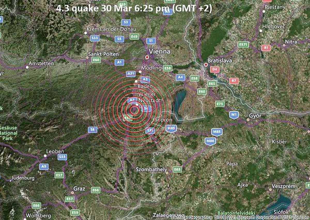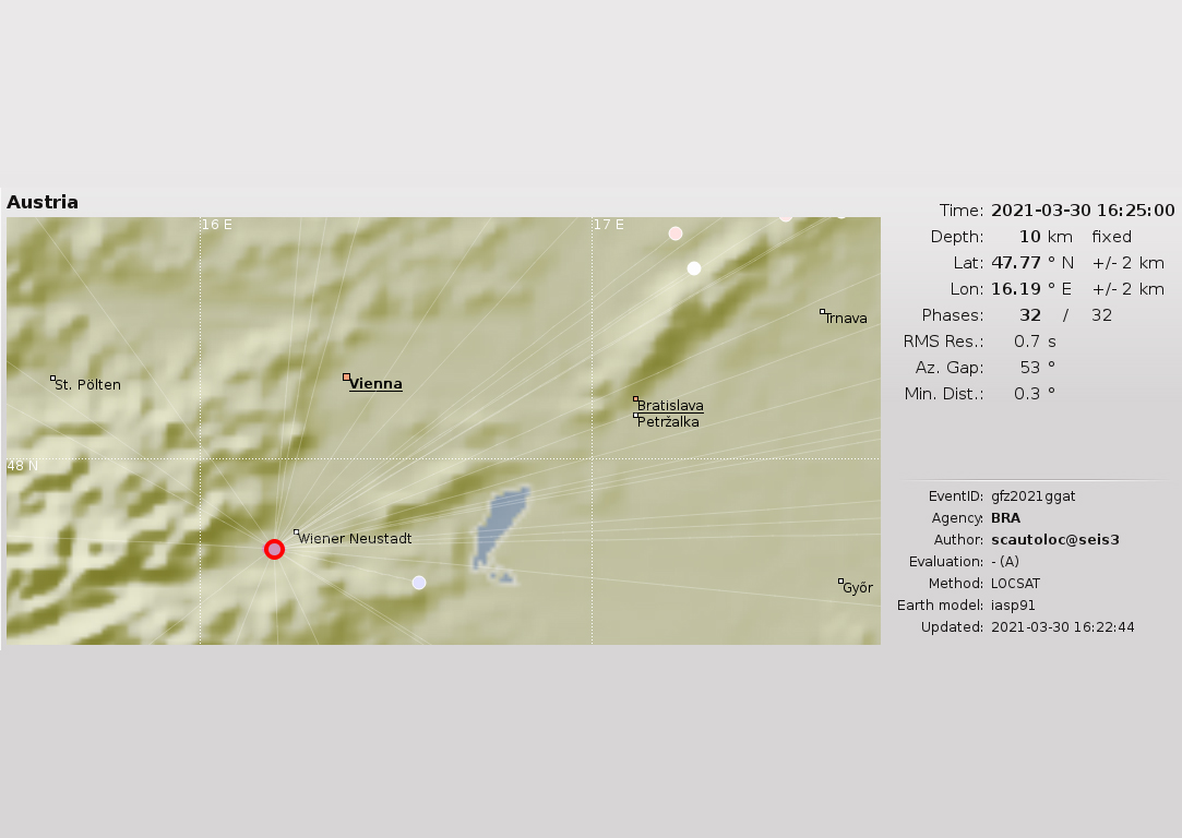 V utorok, 30. marca o 18:25 LSEČ (16:25 svetového času) seizmické stanice Národnej siete seizmických staníc (NSSS), prevádzkované Ústavom vied o Zemi SAV a Lokálnej seizmickej siete východné Slovensko (LSSVS), prevádzkovanej Fakultou matematiky, fyziky a informatiky UK zaznamenali zemetrasenie z ohniskovej zóny Viedenské Nové Mesto (Wiener Neustadt). Jeho epicentrum bolo zhruba 5 km juhozápadne od mesta Viedenské Nové Mesto.