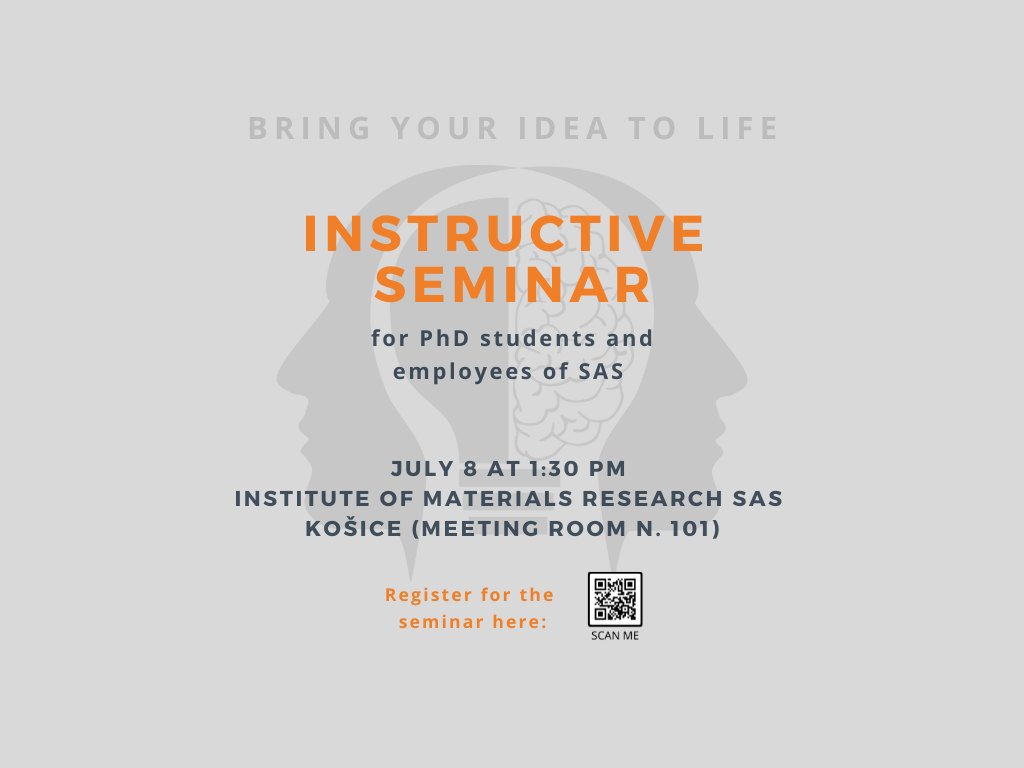 Kancelária pre transfer technológií SAV pozýva všetkých doktorandov a zamestnancov SAV v Košiciach na Inštruktívny seminár, ktorý sa uskutoční dňa 8. júla 2021 o 13:30 hod. v priestoroch Ústavu materiálového výskumu SAV Košice (zasadačka č. 101). Pre účasť je potrebné sa registrovať na https://form.jotform.com/211862153280349.