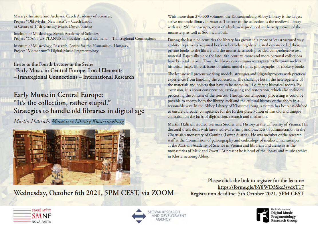 Dňa 6. októbra 2021 o 17:00 (CET) sa uskutoční on-line interdisciplinárna prednáška Dr. Martina Haltricha, vedúceho Knižnice augustiniánov v Klosterneuburgu, na tému „It‘s the collection, rather stupid. Strategies to handle old libraries in digital age“. Registrácia na prednášku je možná prostredníctvom linku do 5. októbra 2021 (5PM CEST).