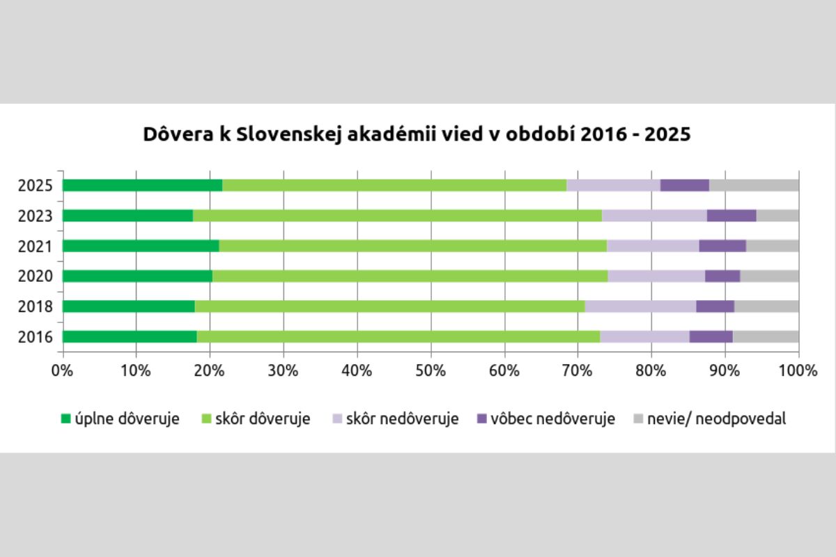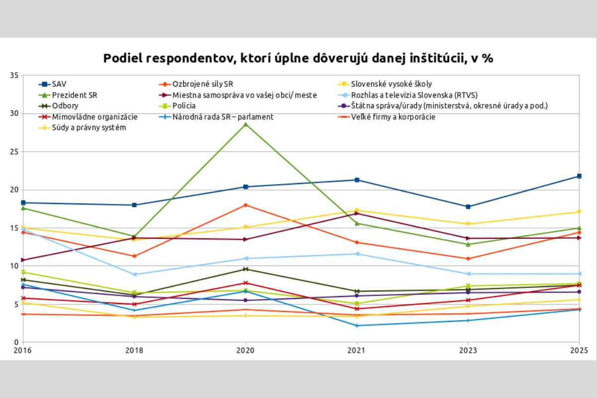 Celkovo však, tak ako pred dvomi rokmi, aj v roku 2025 má SAV medzi štrnástimi porovnávanými inštitúciami najvyšší podiel respondentov, ktorí jej úplne dôverujú. Tento podiel narástol z 17,8 % v roku 2023 na 21,8 % v aktuálnom meraní.
