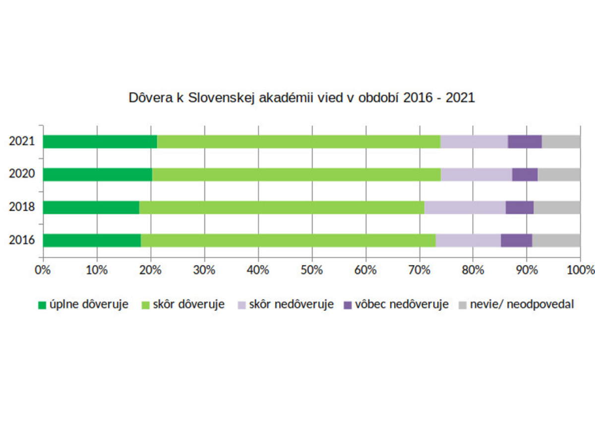 Reprezentatívny prieskum dôveryhodnosti inštitúcií, ktorý začiatkom júna 2021 realizovala agentúra FOCUS, potvrdil stabilitu pozície Slovenskej akadémie vied. Je najdôveryhodnejšou spomedzi pätnástich porovnávaných inštitúcií na Slovensku. Výsledky merania potvrdili, že SAV úplne alebo skôr dôveruje 74 percent respondentov.