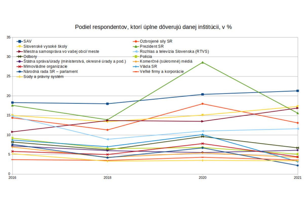 V dôveryhodnosti sa SAV umiestnila tesne pred slovenskými vysokými školami, ktorým dôveruje 71,2 percenta respondentov. Naopak, najmenšej miere dôvery sa tešia Národná rada Slovenskej republiky a Vláda Slovenskej republiky. V porovnaní s minulým rokom, keď sa zber dát uskutočnil na konci prvej vlny pandémie, zaznamenali najvýraznejší pokles dôvery.