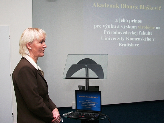 Na tému Akademik Blaškovič a jeho prínos pre výučbu a výskum virológie na Prírodovedeckej fakulte Univerzity Komenského s obrazovou prezentáciou vystúpila prof. Jela Mistríková, CSc., s prezentáciou Dionýz Blaškovič a výskum vírusov chrípky vo Virologickom ústave SAV RNDr. Gustáv Russ, DrSc. a na záver akademikova vnučka RNDr. Martina Labudová z Virologického ústavu SAV predniesla prednášku Mechamizmus šírenia lymfocytárnej choriomeningitídy počas perzistentnej infekcie.