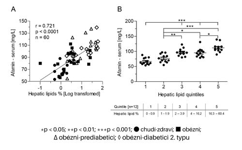 Afamín je glykoproteín, ktorý sa tvorí v pečeni a uvoľňuje do krvi v relatívne vysokých koncentráciách. Napriek tomu, že jeho úloha v organizme doteraz nie je objasnená, predchádzajúce práce naznačili, že jeho zvýšenie v krvi sa spája so zvýšeným rizikom metabolických ochorení u človeka. V našej práci sme sa zamerali na reguláciu systémových hladín afamínu v spojení s obezitou, inzulínovou rezistenciou, poruchou glukózovej tolerancie a novo diagnostikovaným diabetom 2. typu. Súčasne sme sa pozreli na reguláciu afamínu po trojmesačnej tréningovej intervencii u pacientov s obezitou a prediabetom. Ukázalo sa, že na rozdiel od obezity sa prítomnosť prediabetu a diabetu spája so zvýšenými hladinami afamínu, ktoré navyše pozitívne korelujú s viacerými parametrami adipozity (percento telesného tuku, veľkosť adipocytov), inzulínovej rezistencie (HOMA-IR, inzulinémia, C-peptid) a negatívne s citlivosťou na inzulín (EHZ zámka). Najdôležitejším zistením bolo, že zvýšené hladiny afamínu v sére sú asociované so zvýšenou akumuláciou lipidov v pečeni (merané 1H-MRS, Obr.A-B), ako aj so zvýšením markerov poškodenia pečene (ALT, AST, GMT) a indexom stukovatenia pečene (FLI), naznačujúc, že afamín by mohol byť klinicky relevantným markerom zvýšenej akumulácie lipidov v pečeni. Napriek tomu, že trojmesačná tréningová intervencia nezmenila sérové hladiny afamínu, zlepšenie parametrov metabolizmu glukózy po cvičení pozitívne korelovalo so zmenami koncentrácie afamínu.