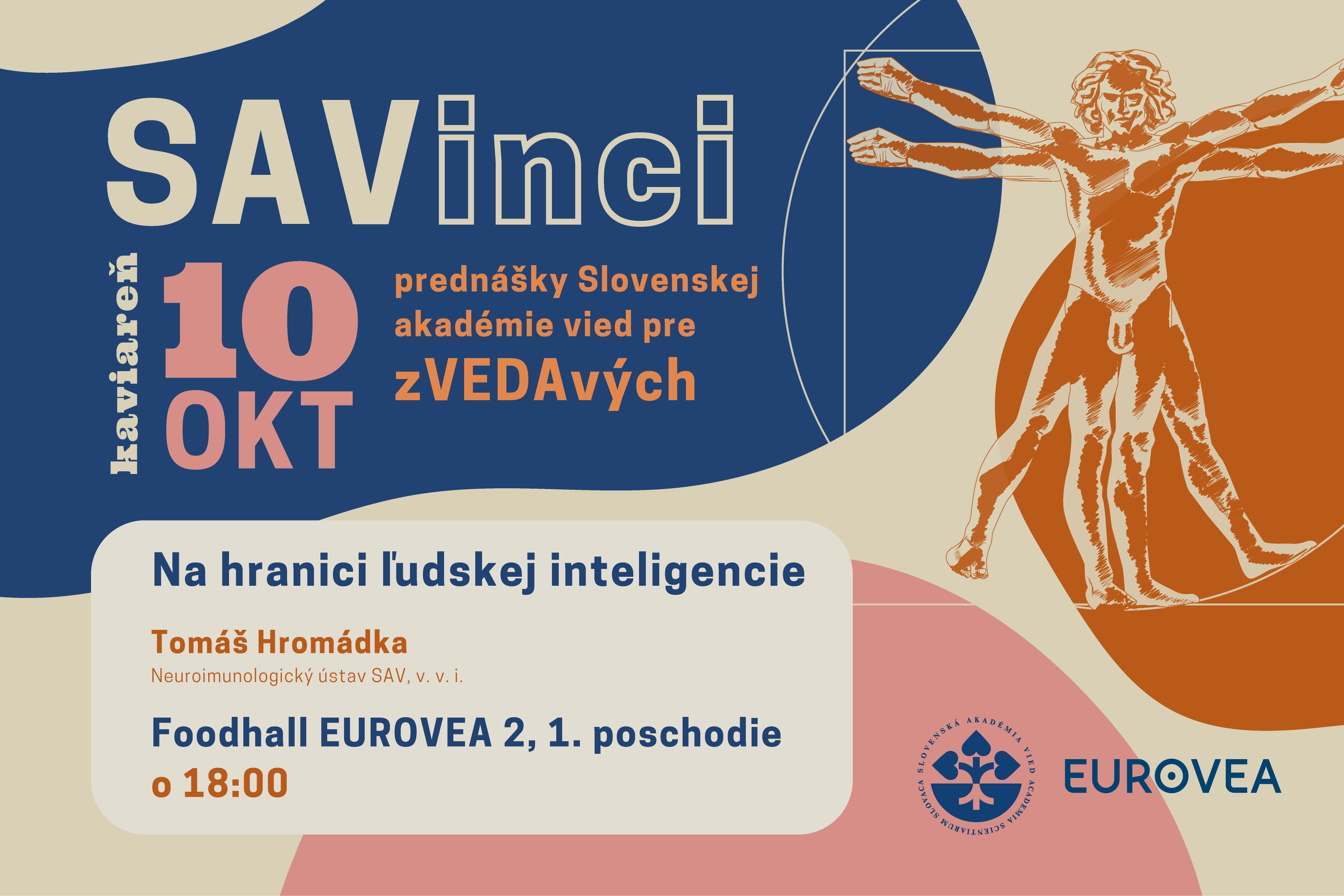 Každý druhý utorok v mesiaci sa nadšenci vedy môžu stretnúť v Eurovei v Bratislave na SAVinci kaviarni – pravidelných popularizačných prednáškach vedcov a vedkýň zo Slovenskej akadémie vied. Najbližšie, 10. októbra 2023 o 18.00 hod, sa prednáškou na tému Na hranici ľudskej inteligencie predstaví neurovedec Tomáš Hromádka z Neuroimunologického ústavu SAV, v. v. i.