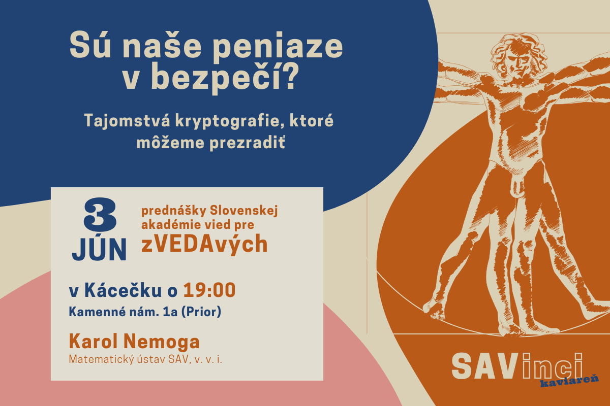Júnová vedecká kaviareň SAVinci, ktorá sa uskutoční v pondelok 3. júna 2024 o 19.00 hod. v bratislavskom Kácečku (OD Prior), bude s riaditeľom Matematického ústavu SAV, v. v. i., odborníkom v oblasti teoretickej kryptológie a bezpečnosti komunikácie Karolom Nemogom.