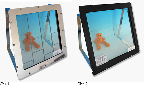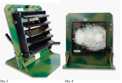 Na zníženie výrobných nákladov (významnú úlohu hrá najmä cena zafíru) v rámci projektu vyvinuli aj cenovo dostupnejšiu alternatívu, ktorá pozostáva z vrstveného skla zabezpečujúceho úroveň ochrany STANAG 2, so zafírovým pruhom a úrovňou ochrany 3 v strede okna (obr. 2). Celé okno je potom prekryté oceľovou žalúziou s jednou polykarbonátovou lamelou nad zafírovým pruhom. Žalúzia sa v prípade zvýšeného rizika uzavrie (obr. 3). Pre celé okno je tak zabezpečená úroveň ochrany 3, pri zachovaní dostatočného zorného poľa pre vodiča a posádku vozidiel. Obr. 4 zobrazuje zadnú stranu panciera po balistickom teste, po zásahu troma strelami kalibru 7,65 s jadrom z karbidu volfrámu letiacej rýchlosťou 900 m/s. U danej konštrukcie existuje potenciál na ďalšie zvýšenie ochrany až na úroveň 4 (protipancierová munícia kaliber 14,5 mm).