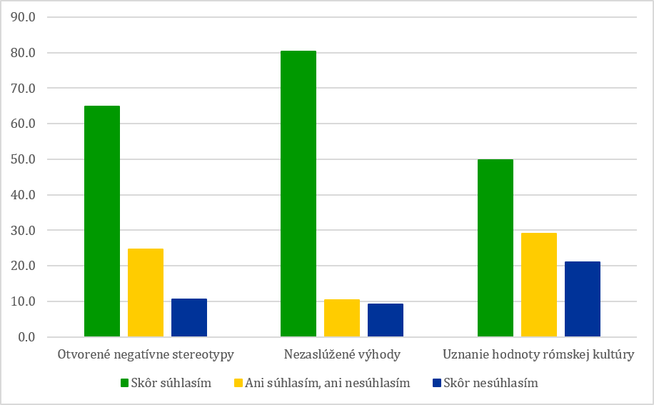 Pokiaľ ide o stereotypné postoje voči Rómom (graf 1), najviac respondentov (80 percent) skôr súhlasilo s tvrdeniami, že Rómovia na Slovensku majú nezaslúžené výhody a využívajú sociálny systém (napr. „Rómovia v tejto krajine sú v niektorých oblastiach zvýhodňovaní.“) a takmer dve tretiny respondentov (64 percent) sa skôr stotožňovali s otvorene negatívnymi stereotypmi o Rómoch (napr. „Je len veľmi málo slušných alebo rozumných Rómov.“). Na druhej strane len polovica respondentov skôr súhlasila s tvrdeniami, ktoré vyzdvihujú hodnotu rómskej kultúry (napr. „Rómovia môžu byť hrdí na svoje kultúrne dedičstvo.”).