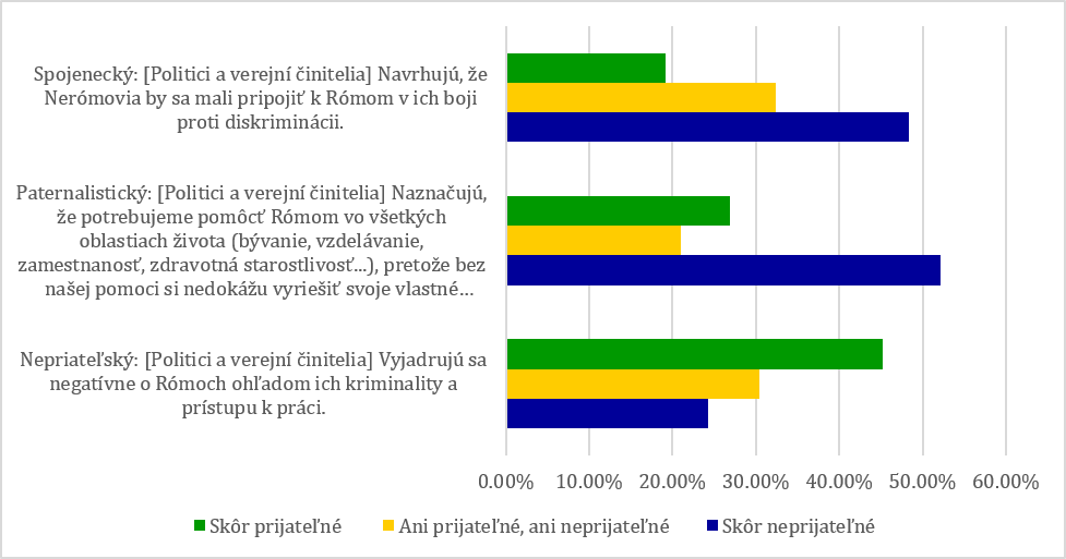 Okrem stereotypných postojov sme skúmali, do akej miery sú pre respondentov prijateľné tri typy politických diskurzov, t. j. vyjadrení politikov o Rómoch: (1) nepriateľský politický diskurz, ktorý zdôrazňuje otvorené negatívne stereotypy o Rómoch, napr. že sú leniví alebo kradnú; (2) paternalistický politický diskurz, ktorý zdôrazňuje, že musíme Rómom pomáhať, pretože sú na pomoc majority odkázaní a bez nej by to sami nezvládli a (3) spojenecký politický diskurz, ktorý naznačuje, že Nerómovia sa musia aktívne postaviť proti diskriminácii spoločne s Rómami. Respondenti označili za najprijateľnejší nepriateľský politický diskurz, ktorý skôr akceptovalo 45,2 percenta opýtaných (graf 2). Za výrazne menej prijateľné označili paternalistický diskurz (skôr ho akceptovalo 26,9 percenta respondentov a vyše 50 percent respondentov ho skôr neakceptovalo) a spojenecký politický diskurz (skôr ho akceptovalo 19,2 percenta respondentov, pričom takmer 50 percent ho skôr neakceptovalo). S nepriateľským politickým diskurzom sa viac stotožnili tí respondenti, ktorí sa zároveň domnievali, že Rómovia na Slovensku majú nezaslúžené výhody a stotožňovali sa s otvorene negatívnymi stereotypmi.