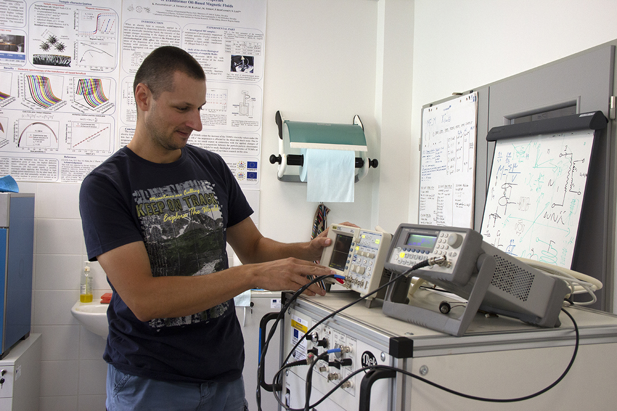 „V poslednom ročníku môjho doktorandského štúdia (v roku 2015) sa nášmu tímu podarilo zaznamenať zaujímavé reverzibilné štruktúrne zmeny v magnetickej kvapaline pod vplyvom elektrického poľa. Keďže doposiaľ bola vedecká pozornosť venovaná najmä intuitívnej štrukturalizácii magnetických kvapalín v magnetickom poli, rozhodli sme sa intenzívnejšie zaoberať sa práve štruktúrou a dynamikou magnetických kvapalín v elektrickom poli. Naše nedávne experimenty naznačujú, že polarizované zhluky magnetických nanočastíc menia distribúciu elektrického poľa v magnetickej kvapaline a môžu slúžiť ako záchytné centrá voľného elektrického náboja. Je možné, že práve vďaka tomu dokáže magnetická kvapalina odolávať vyšším elektrickým napätiam ako čistý transformátorový olej,“ povedal Michal Rajňák, ktorý od roku 2018 zameriava svoj vedecký výskum na magnetické kvapaliny pre elektrotechnické aplikácie. Nároky na prenosovú sústavu stúpajú, odborníci z praxe očakávajú od vedcov nové riešenia pri zdokonaľovaní chladiacich médií a zvyšovaní ich účinnosti. Ukazuje sa, že cesta k tomu vedie cez nanomateriály. „Na druhej strane štrukturalizácia magnetickej kvapaliny v elektrickom poli otvára nové možnosti výskumu a potenciálnych aplikácií. Ako sme navrhli v nedávnej práci (Phys. Rev. Applied 11, 024032), javy súvisiace s elektricky riadenou štrukturalizáciou magnetických kvapalín môžu nájsť využitie v oblasti senzoriky, spínania a možno aj nanorobotiky,“ dodáva Michal Rajňák.