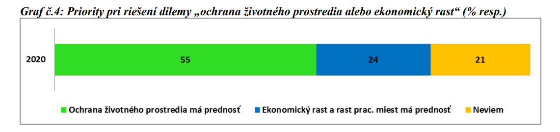 K názoru, že dôležitejšia je ochrana životného prostredia, a to aj za cenu pomalšieho ekonomického rastu a určitého úbytku pracovných miest, sa v novembri 2020 priklonila nadpolovičná väčšina respondentov (55 percent). Približne štvrtina opýtaných (24 percent) považovala za prvoradé najmä vytvorenie podmienok pre ekonomický rast a rast pracovných miest, hoci aj za cenu negatívnych dôsledkov na životné prostredie. Z hľadiska skupinových rozdielov preferujú ekonomický rast najmä starší respondenti nad 60 rokov. Vyššiu prioritu ekonomike častejšie pripisujú aj ľudia so základným alebo stredným vzdelaním bez maturity, ktorých pozícia na trhu práce je ohrozenejšia.
