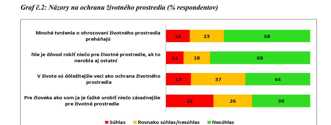 Pri skúmaní toho, ako verejnosť reaguje na argumenty zľahčujúce dôležitosť ochrany životného prostredia, bola použitá batéria štyroch tvrdení. Výroky na jednej strane spochybňujú celkovú dôležitosť ochrany životného prostredia alebo spochybňujú prínos individuálnej snahy pri ochrane životného prostredia. Z údajov v grafe č. 2 je zrejmé, že postoje zľahčujúce význam ochrany životného prostredia nemajú u obyvateľov vysokú podporu a skepticky naladených ľudí je na Slovensku len nízky podiel. V grafe môžeme sledovať, že najvyšší podiel nesúhlasu bol zaznamenaný pri tvrdení Nie je dôvod robiť niečo pre životné prostredie, ak to nerobia aj ostatní, s ktorým nesúhlasia viac ako dve tretiny opýtaných (68 percent). Nerozhodných bolo pri tomto postoji 18 percent opýtaných a súhlasilo len 12 percent opýtaných. Vyšší podiel nesúhlasu sme zaznamenali tiež pri tvrdení Mnohé tvrdenia o ohrozovaní životného prostredia preháňajú, pri ktorom bol podiel nesúhlasu na úrovni 58 percent. Zhruba štvrtina bola v tomto prípade nevyhranených (23 percent) a podporu deklarovalo 16 percent respondentov.
