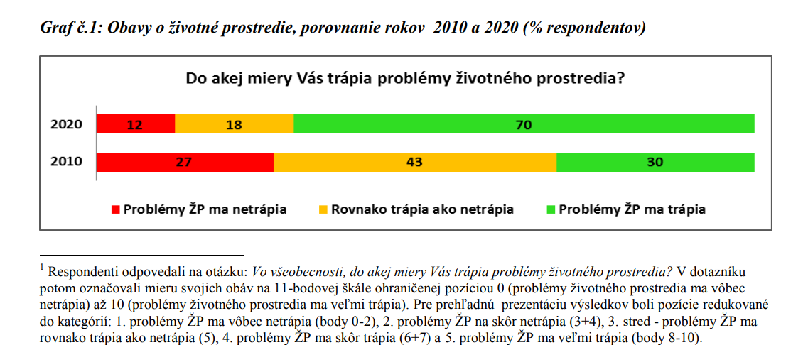 Údaje sme zároveň porovnali s dostupnými dátami z roku 2010, pričom je zrejmé, že problémy životného prostredia trápia v súčasnosti výrazne väčší podiel obyvateľov Slovenska. Naopak významne poklesol podiel nerozhodných a tých, ktorých tieto problémy netrápia. Pri obavách o životné prostredie sa ako významné ukázali skupinové rozdiely na základe vzdelania. V najvyššej miere vyjadrujú obavy o životné prostredie respondenti s vysokoškolským vzdelaním. Naopak v skupine tých, ktorých tento problém netrápi, sú početnejšie zastúpení ľudia so základným vzdelaním.