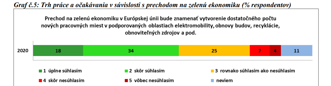Na základe výsledkov možno konštatovať, že očakávania obyvateľov ohľadom vývoja na trhu práce sú prevažne pozitívne. Spolu 52 percent respondentov očakáva, že v podporovaných ekonomických odvetviach sa vytvorí dostatočný počet nových pracovných miest. Nerozhodný názor deklarovalo 25 percent opýtaných a negatívne očakávania má pomerne nízky podiel 11 percent opýtaných. Očakávania respondentov sú úzko prepojené s dôverou k Európskej únii, tí ktorí tejto inštitúcii deklarujú dôveru, majú častejšie pozitívne očakávania. Naopak deklarovaná nedôvera voči EÚ sa prejavuje aj vo vyššom zastúpení negatívnych očakávaní týkajúcich sa prechodu na zelenú ekonomiku.