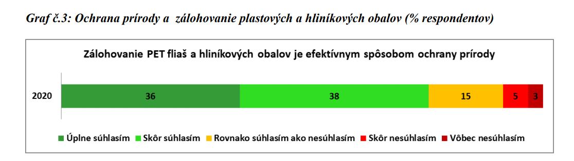Podľa tohto výskumu zálohovanie PET fliaš a hliníkových obalov považujú za efektívny spôsob ochrany prírody takmer tri štvrtiny opýtaných (74 percent). Nesúhlas vyjadrilo len osem percent opýtaných. Ochrana životného prostredia má mať podľa väčšiny občanov Slovenska prioritu pred ekonomickým rastom. Názor, podľa ktorého je dôležitejšia ochrana životného prostredia než ekonomický rast, v novembri 2020 deklarovalo 55 percent respondentov. V súvislosti s prechodom na zelenú ekonomiku sú očakávania obyvateľov ohľadom vývoja na trhu práce pozitívne, 52 percent respondentov očakáva vytvorenie dostatočného počtu nových pracovných miest v podporovaných ekonomických odvetviach.