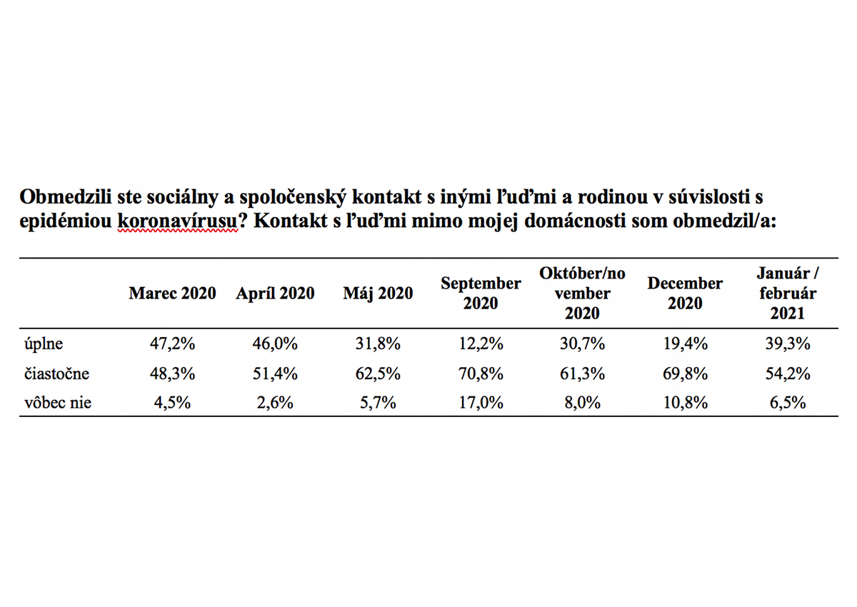 Silnejúce obavy sa výrazne prejavili aj v miere, v akej respondenti obmedzili kontakty s ľuďmi mimo svojej domácnosti. Na prelome januára a februára 39,3 percenta respondentov uviedlo, že tieto kontakty obmedzili úplne. To je o takmer 9 percentuálnych bodov vyššie obmedzenie kontaktov ako počas lockdownu v čase prvého celoplošného testovania. Úplné obmedzenie kontaktov deklarujú častejšie starší respondenti, respondenti, ktorí sa obávajú epidémie, a respondenti, ktorí dôverujú vedeckým inštitúciám na Slovensku. Svoje kontakty menej často obmedzili muži.