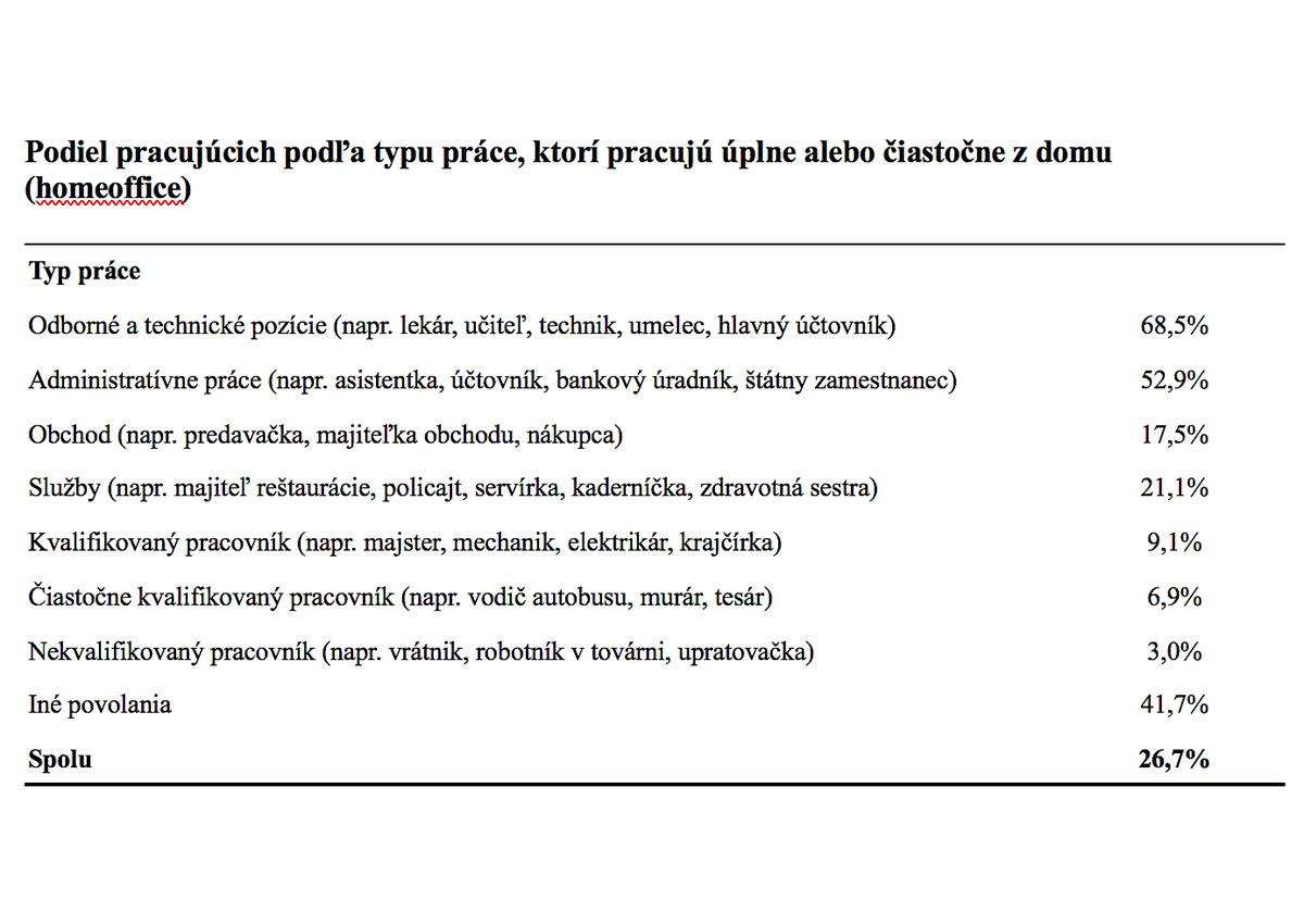 Okrem respondentov, ktorí majú od zamestnávateľa homeoffice počas celého týždňa, časť respondentov pracuje z domu aspoň niektoré dni. Spolu homeoffice alebo možnosť pracovať z domu aspoň niektoré dni v týždni aktuálne využíva 26,7 percenta respondentov. Zastúpenie respondentov, ktorí majú možnosť pracovať z domu aspoň niektoré dni v týždni, je rôzna podľa typu práce. No napríklad aj v prípade práce administratívnej povahy takmer polovica respondentov do práce naďalej chodí tak ako pred epidémiou.