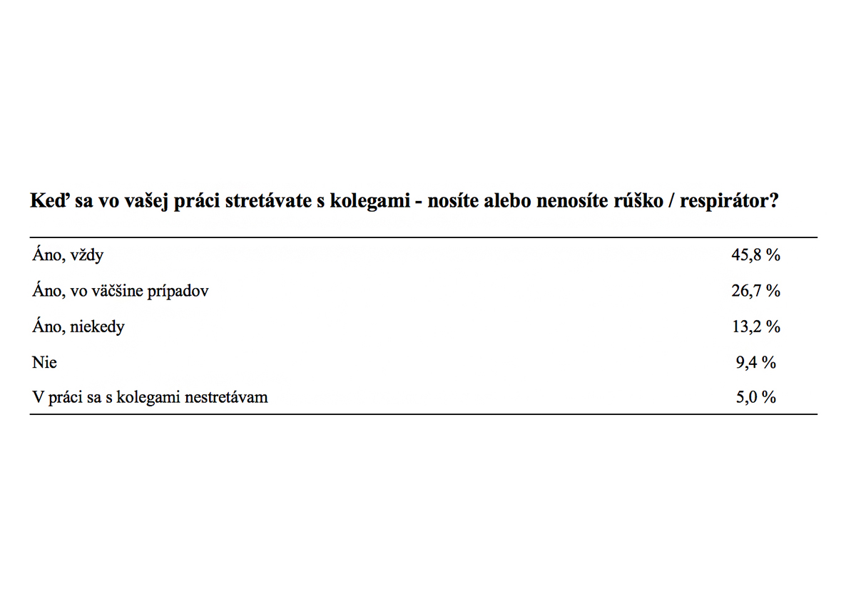 V situácii, keď sú zatvorené školy, je pracovisko jedným z posledných miest, kde je možné stretnúť viac ľudí. Na otázku, či respondenti používajú v práci pri stretnutiach s kolegami rúško alebo respirátor, odpovedalo „áno, vždy“ 45,8 percenta pracujúcich respondentov. Viac ako štvrtina respondentov nosí rúško alebo respirátor vo väčšine prípadov, 13,2 percenta len niekedy a 9,4 percenta respondentov priznalo, že v práci rúško alebo respirátor nenosí.