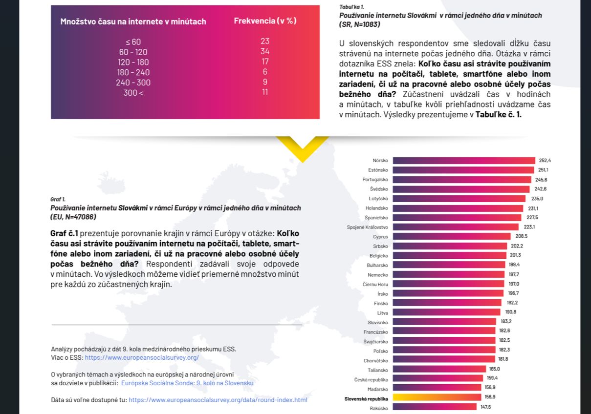 Viac ako tretina Slovákov a Sloveniek trávi na internete jednu až dve hodiny denne. V priemere na internete každý deň strávia 157 minút. Spomedzi všetkých obyvateľov Európy sú na predposlednom mieste. Na chvoste tabuľky je Rakúsko, ktorého obyvatelia a obyvateľky sú online v priemere necelých 148 minút denne. Aj tieto údaje priniesli výsledky 9. kola medzinárodného prieskumu Európska sociálna sonda (2018).