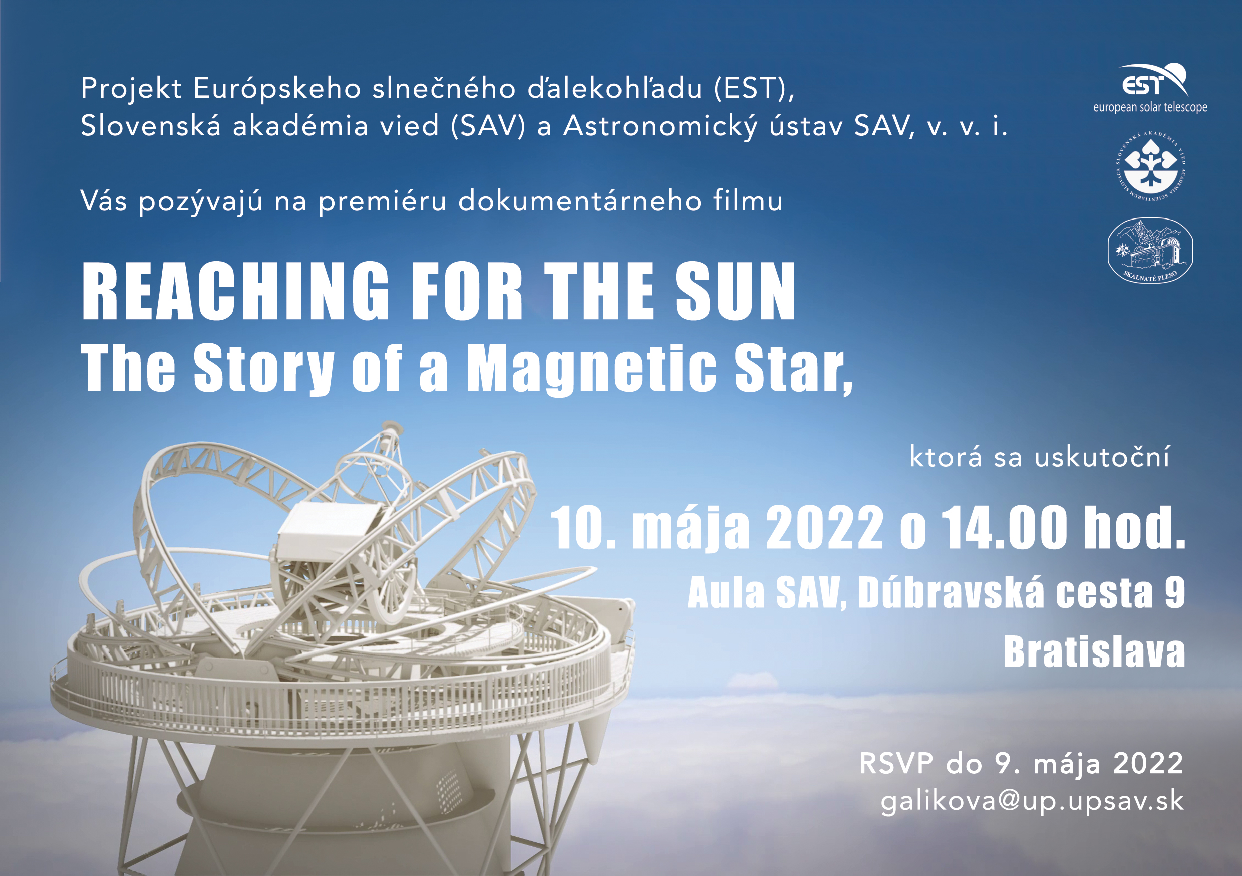 Projekt Európskeho slnečného teleskopu (EST), Slovenská akadémia vied (SAV) a Astronomický ústav SAV, v. v. i., (AsÚ SAV, v. v. i.) pozývajú na premiéru dokumentárneho filmu „Reaching for the Sun – The Story of a Magnetic Star“, ktorá sa uskutoční v utorok 10. mája 2022 o 14.00 hod. v Aule SAV na Dúbravskej ceste 9 v Bratislave.