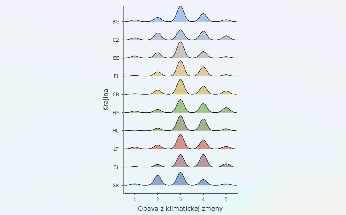 Kým v západných či severských krajinách ako Francúzsko či Fínsko si na základe výsledkov Európskej sociálnej sondy (ESS) menej ako 0,2 percenta respondentov myslí, že klimatická zmena je iba výmysel, na Slovensku je to už viac ako 3,5 percenta respondentov. Podobne je to aj s obavami z klimatických zmien. V porovnaní s ostatnými európskymi krajinami, v ktorých sa realizovalo 10. kolo prieskumu ESS, veľká časť Slovákov nemá z klimatických zmien a jej následkov (napr. na poľnohospodárstvo, biodiverzitu, zdroje pitnej vody či zdravotný stav obyvateľstva) veľké obavy (graf č. 1).