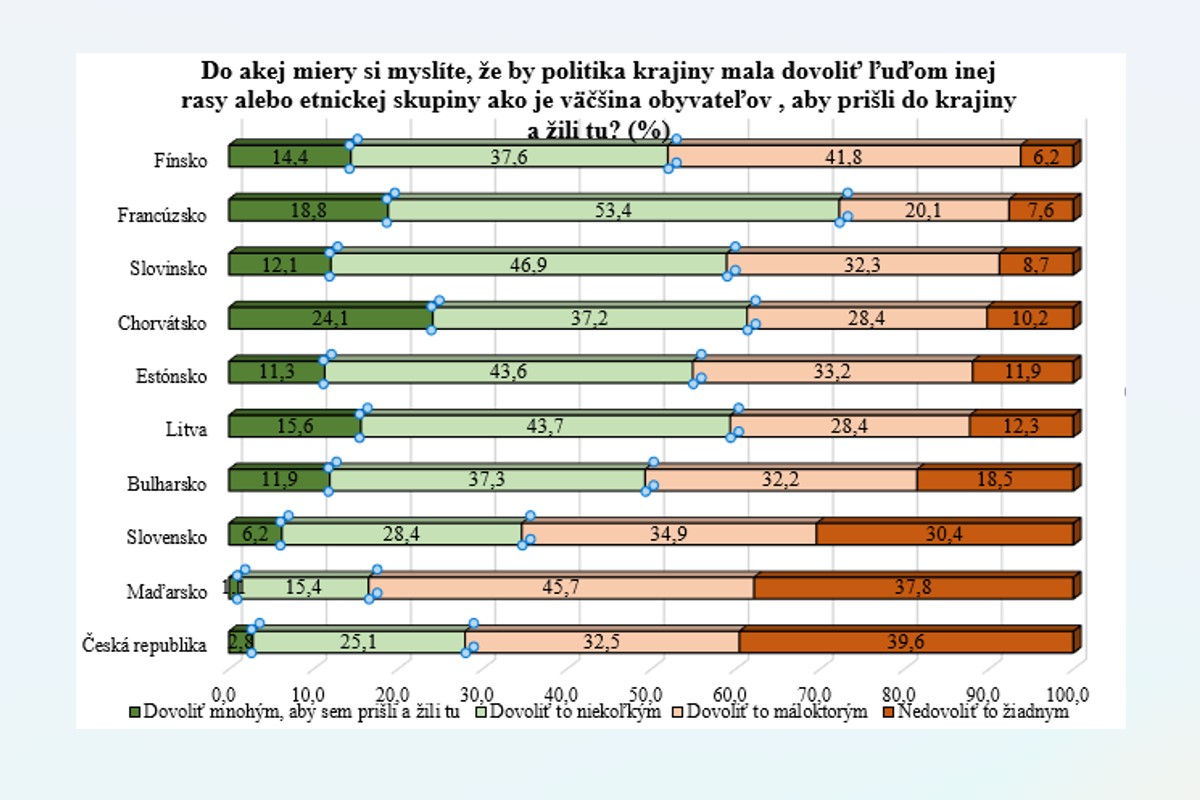 Obyvatelia Českej republiky, Maďarska a Slovenska patria k tým, ktorí vo viac ako tretine prípadov odmietajú ľudí inej rasy alebo etnickej skupiny v svojej krajine (Graf 1). Slovenskí respondenti v 9. kole ESS (2018) odmietli všetkých ľudí inej rasy/etnika v 35,2 percenta prípadoch, zatiaľ čo v 10. kole ESS (2021) to bolo o päť percent menej (30,4 %). Tolerantnejší prístup majú obyvatelia krajín Fínsko, Francúzsko a Slovinsko, kde menej ako 10 percent respondentov označilo možnosť „nedovoliť žiadnym“ ľuďom inej rasy/etnika prísť do krajiny a žiť tam.