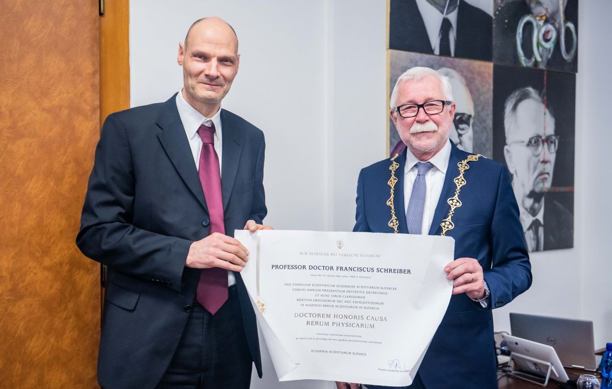 Slovenská akadémia vied udelila vedecký titul Doktor vied honoris causa (Dr. Sc. h. c.) nemeckému vedcovi, fyzikovi prof. Dr. Frankovi Schreiberovi z Fakultät für Physik, Universität Tübingen v Nemeckej spolkovej republike. Vedecká rada SAV mu dala titul najmä za úzku spoluprácu s Fyzikálnym ústavom SAV, v. v. i., a za jeho zásluhy pri podpore vedy a rozvoja experimentálnej fyziky. Slávnostný ceremoniál sa konal v stredu 12. októbra 2022 na pôde SAV, kde si Frank Schreiber prevzal titul z rúk predsedu akadémie prof. Pavla Šajgalíka.