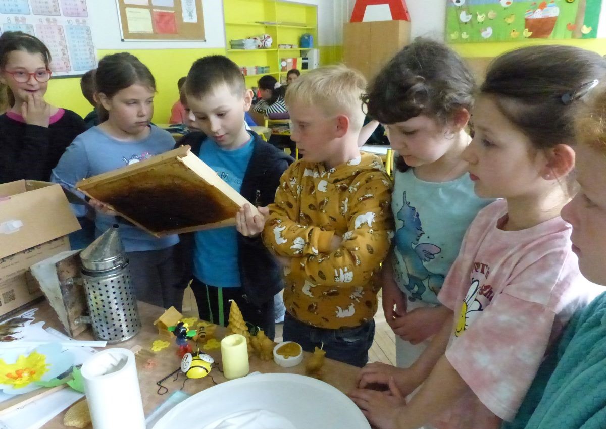 Deti sa oboznámili s biológiou včely medonosnej, včelími produktmi, ale aj škodcami včiel. PowerPointové prezentácie vedkyne z ÚKE SAV, v. v. i., doplnili o praktické ukážky peľovo-medových včelích plástov, včelárskych pomôcok a výroby sviečok zo včelieho vosku.