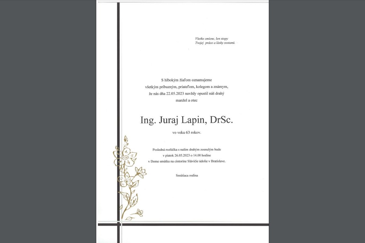 Ing. Juraj Lapin, DrSc., nás po krátkej ťažkej chorobe opustil 22. mája 2023 vo veku 63 rokov. Rozlúčime sa s ním v Dome smútku na cintoríne Slávičie údolie v Bratislave v piatok 26. mája 2023 o 14.00 hodine.