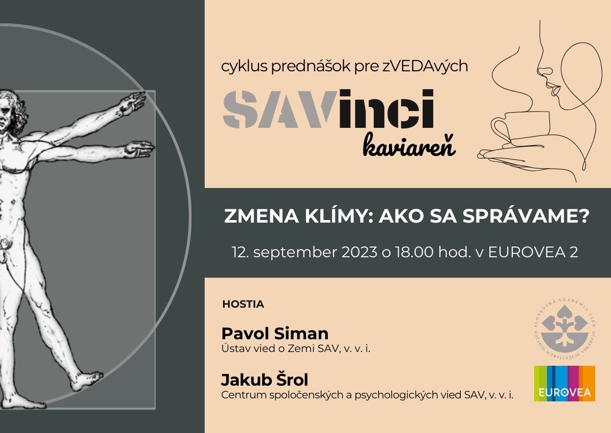Klimatická zmena už dávno nie je len záležitosťou prírodných vied. Čoraz viac sa stáva najmä problémom zmeny ľudských návykov – správania ľudí aj spoločnosti. O pohľade spoločenských vied na zmenu klímy budeme hovoriť vo vedeckej kaviarni SAVinci, ktorá bude 12. septembra 2023 o 18.00 hod. v nových priestoroch Eurovea II. (v časti Foodhall, na schodoch s výhľadom na Dunaj). O jednom z najaktuálnejších globálnych problémov budú hovoriť RNDr. Pavol Siman, PhD., z Ústavu vied o Zemi SAV, v. v. i., a Mgr. Jakub Šrol, PhD., z Ústavu experimentálnej psychológie Centra spoločenských a  psychologických vied SAV, v. v. i.