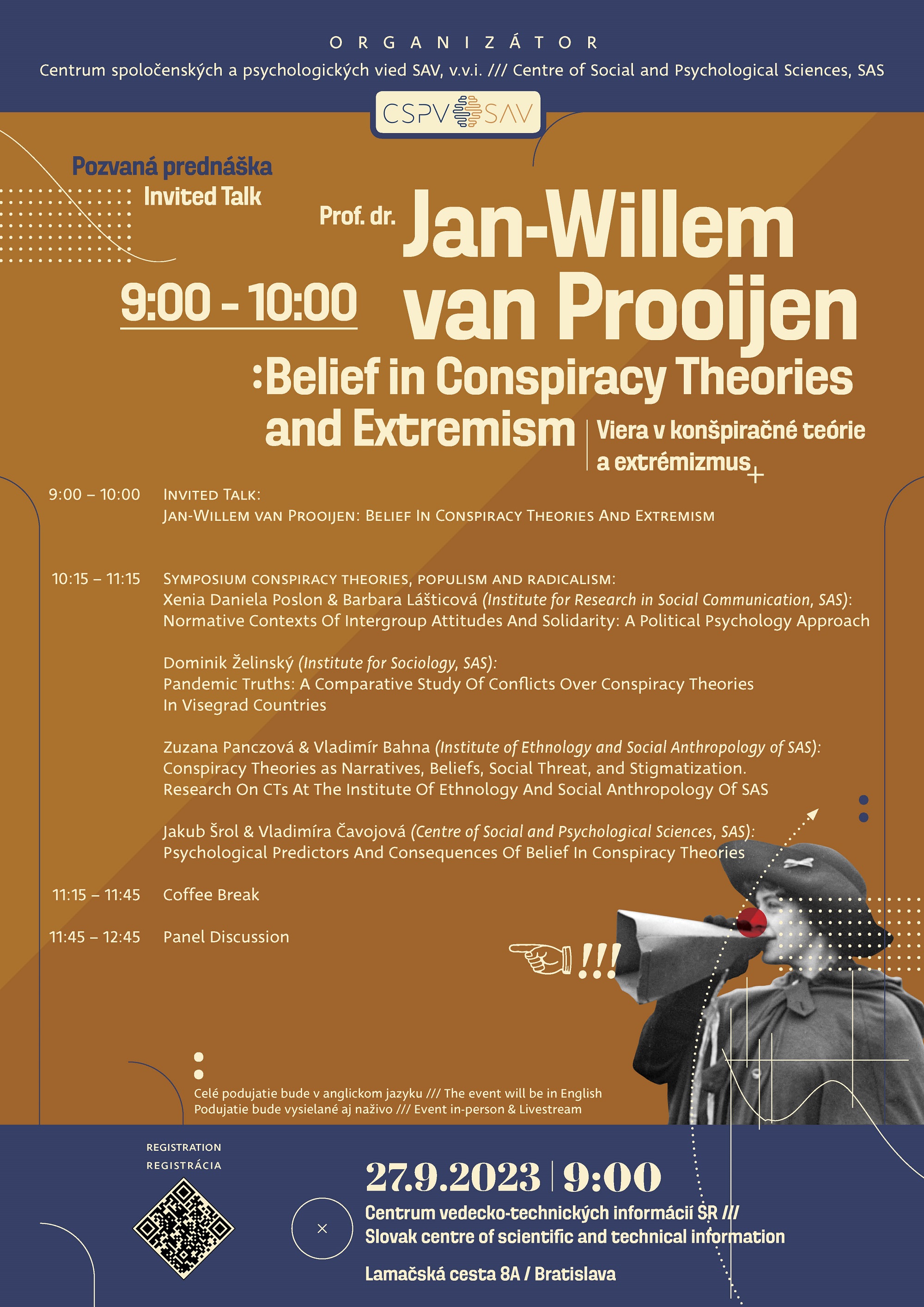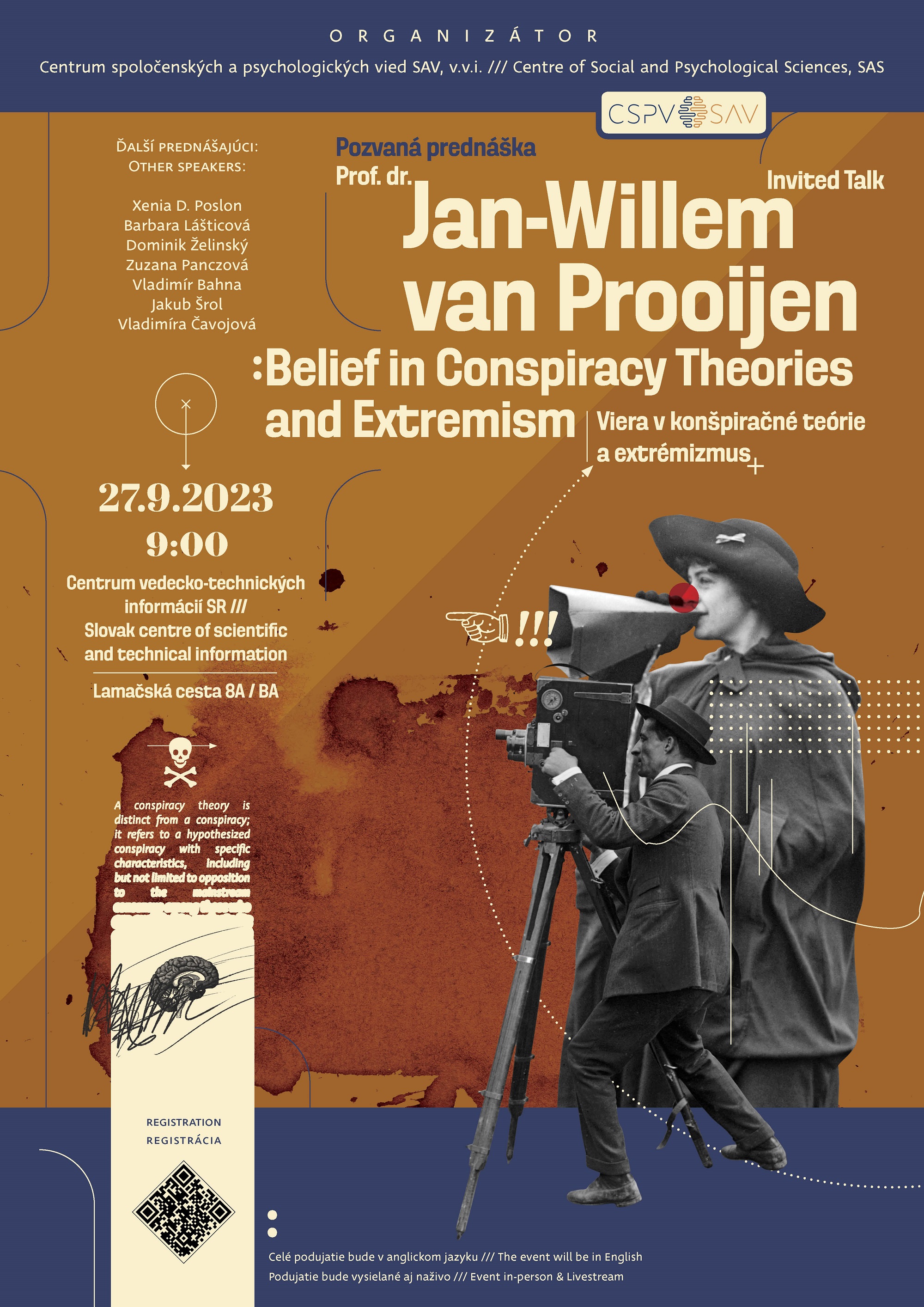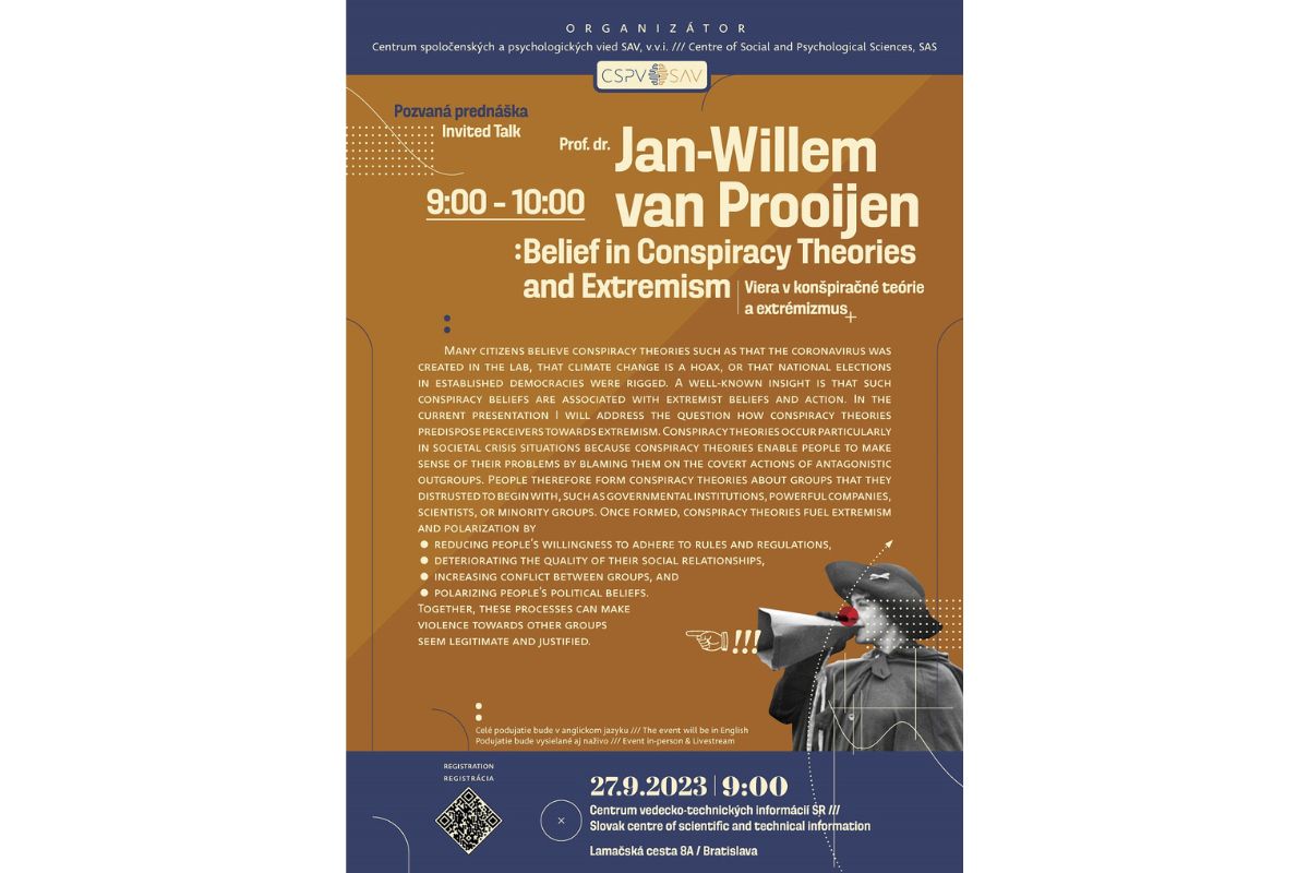 Prečo ľudia veria konšpiračným teóriám, radikalizujú sa a aké sú dôsledky extrémistických ideológií? Aj týmto otázkam sa výskumne venuje svetovo uznávaný holandský psychológ Jan-Wilem van Prooijen, ktorý koncom septembra 2023 navštívi Bratislavu. Pri tejto príležitosti sa v stredu 27. 9. 2023 o 9.00 hod. v Centre vedecko-technických informácií SR (CVTI SR) uskutoční jeho prednáška spojená s vedeckým sympóziom o konšpiračných teóriách, radikalizme a populizme. Na podujatí vystúpia aj experti a expertky zo Slovenskej akadémie vied (SAV). Vstup je voľný, podmienkou je registrácia.