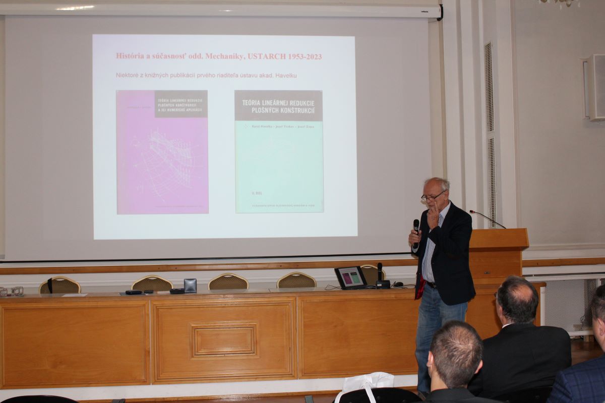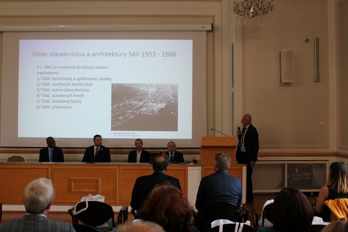 Sympózium pokračovalo odbornou časťou sympózia, ktorej obsahom boli prezentácie výsledkov a plánov troch oddelení ústavu v historickom kontexte. Prof. Ján Sládek vyzdvihol históriu oddelenia aplikovanej mechaniky, ako aj úspechy našich vedcov doma i vo svete. Zreferoval aj o súčasných vedeckých témach riešených na oddelení. Prof. Palou sa zameral na súčasný výskum na oddelení stavebných materiálov a konštrukcií, pričom medzi priority ústavu zaradil medzinárodnú spoluprácu. Dr. Kómar zhrnul posledné roky výkumu na oddelení optiky a termofyziky a načrtol možný budúci vývoj pracoviska.