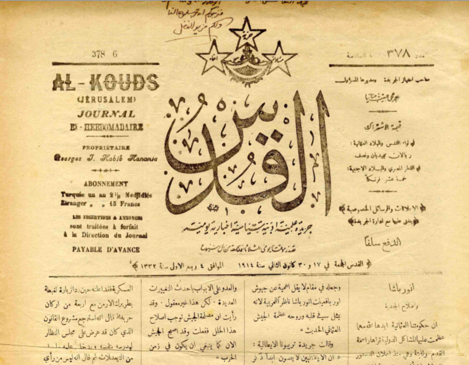 Noviny al-Quds [Jeruzalem], č. 378, 17.1.1914, s. 1