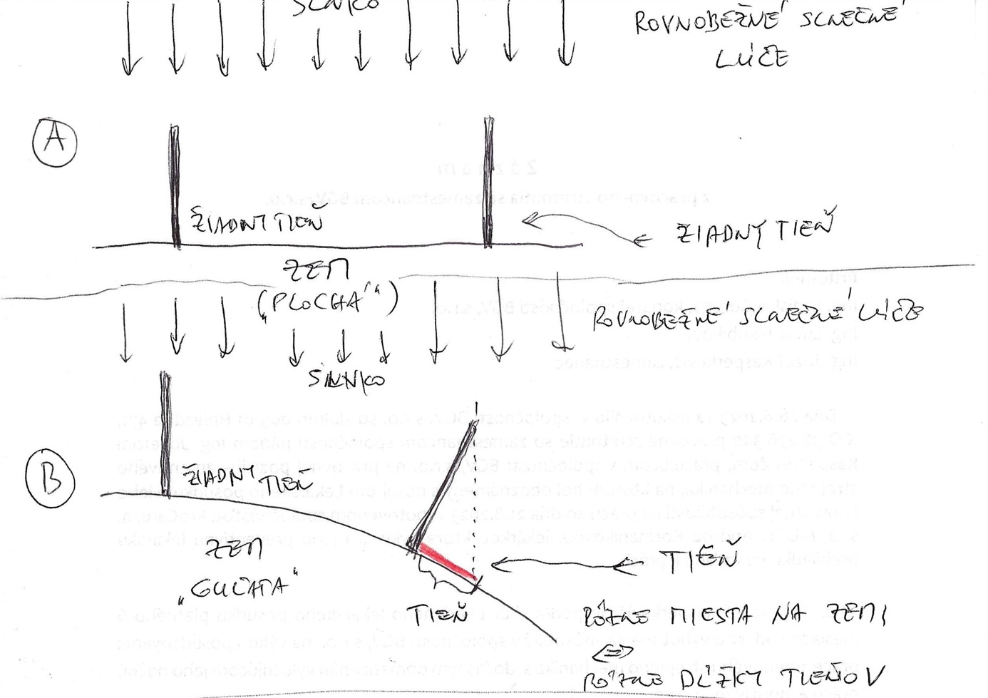 Pre lepšiu názornosť je na obrázku č. 1 uvedený zjednodušený schematický náčrt Eratosthenovho experimentu. Teda situácia, keď sú na dvoch rôznych miestach na Zemi, v ten istý deň a v tom istom čase umiestnené dve rovnako dlhé palice. V oboch prípadoch dopadajú rovnobežné slnečné lúče v smere „priamo zhora“. V prípade A – ak by bola Zem plochá – ani jedna palica by nevrhala tieň. V prípade B – ak uvažujeme, že Zem je guľatá – jedna z palíc by  nevrhala žiadny tieň, ale druhá palica (na inom mieste na Zemi) by tieň vrhala a to preto, že rovnobežné slnečné lúče by na ňu už nedopadali „priamo zhora“.