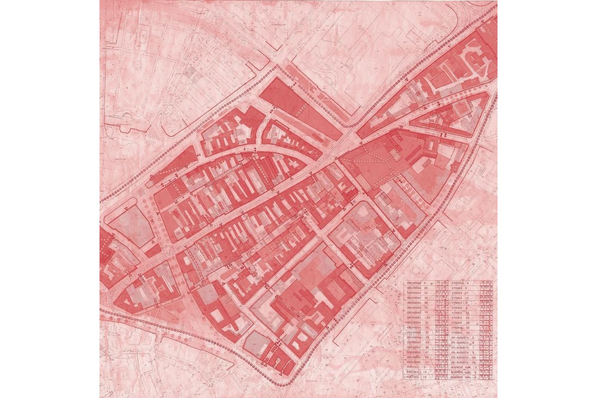 Jakub Kopec približuje architektonické riešenie výstavy: „Prostredníctvom nadrozmerných archov papiera a tubusov, do ktorých sa tieto archy pôvodne ukladali, sprítomňuje atmosféru projektových ústavov, kde plány mesta vznikali. Tento dojem umocňuje aj motív pravouhlej mriežky vyjadrujúci mierku zobrazenia jednotlivých ilustrácií, ale aj racionalitu plánovania.”