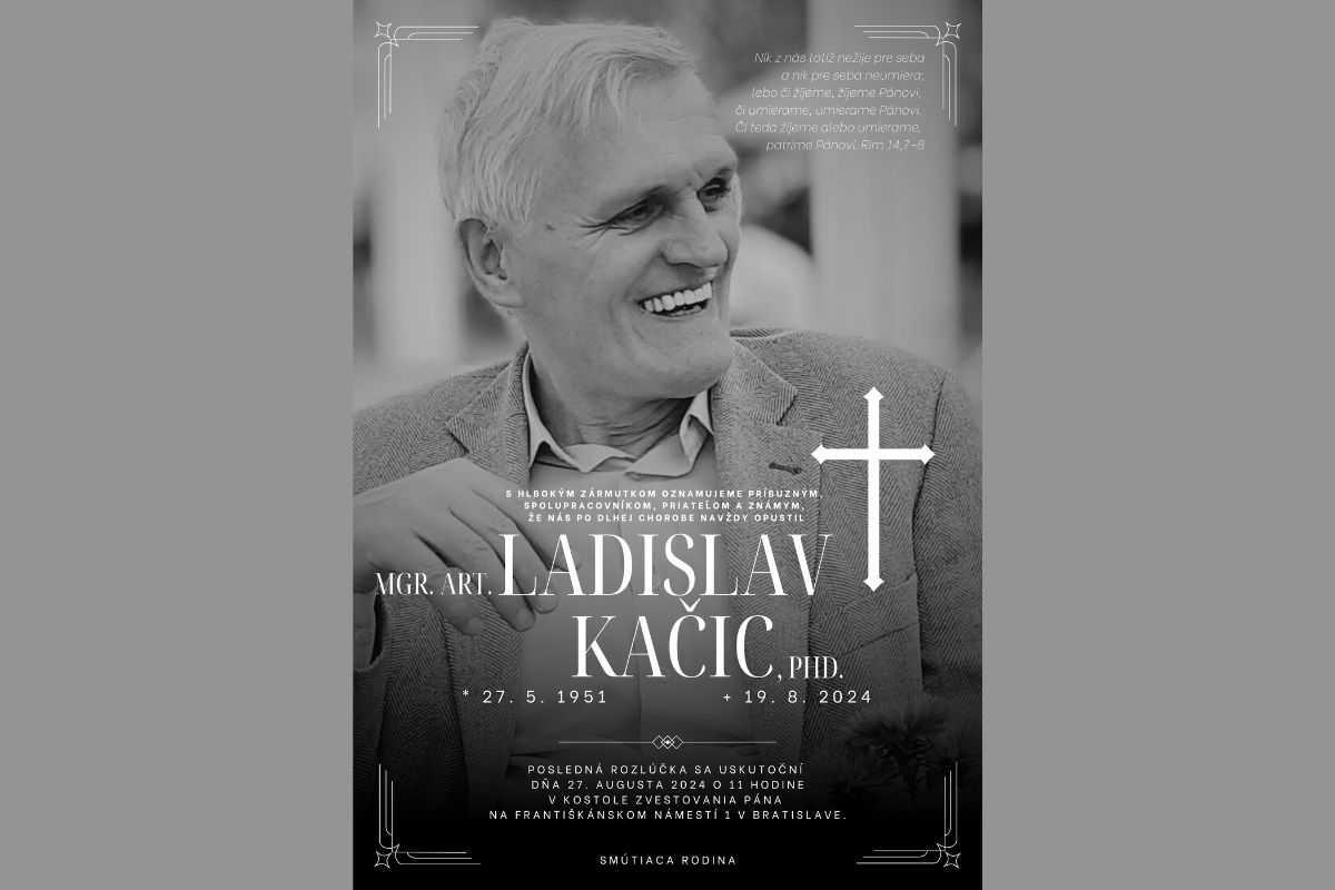 V pondelok 19. augusta 2024 nás vo veku 73 rokov po dlhej chorobe navždy opustil dlhoročný vedecký pracovník Slavistického ústavu Jána Stanislava SAV, v. v. i., Mgr. art. Ladislav Kačic, PhD. Posledná rozlúčka so zosnulým sa uskutoční v utorok 27. augusta o 11.00 hodine v Kostole zvestovania Pána na Františkánskom námestí 1 v Bratislave.