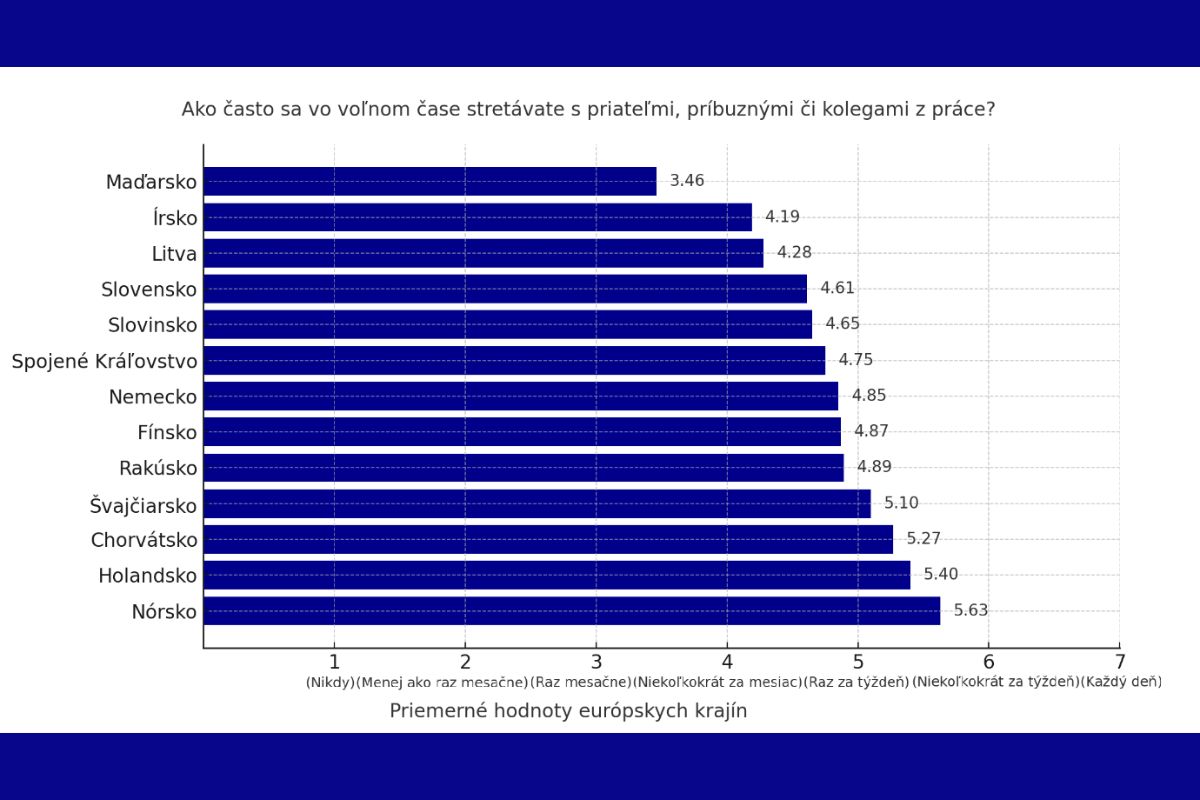 • Slovensko dosahuje priemernú frekvenciu stretávania sa (4,61), čo ho radí do strednej časti rebríčka a najbližšie zodpovedá odpovedi Raz za týždeň. Slováci sa stretávajú so svojimi blízkymi menej často ako napríklad v Nemecku (4,85), no častejšie ako v Maďarsku (3,46) alebo Írsku (4,19).