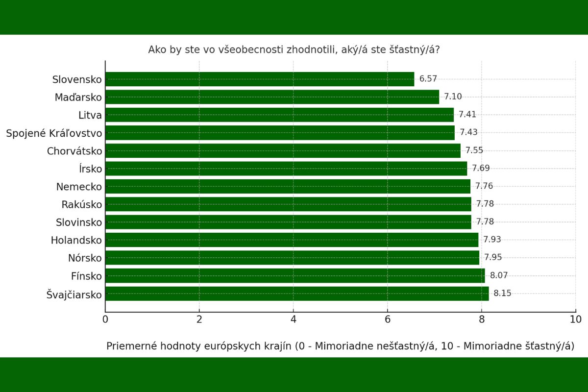 • Slovensko má priemernú úroveň šťastia (6,57), čo ho radí na chvost spomedzi krajín v analýze