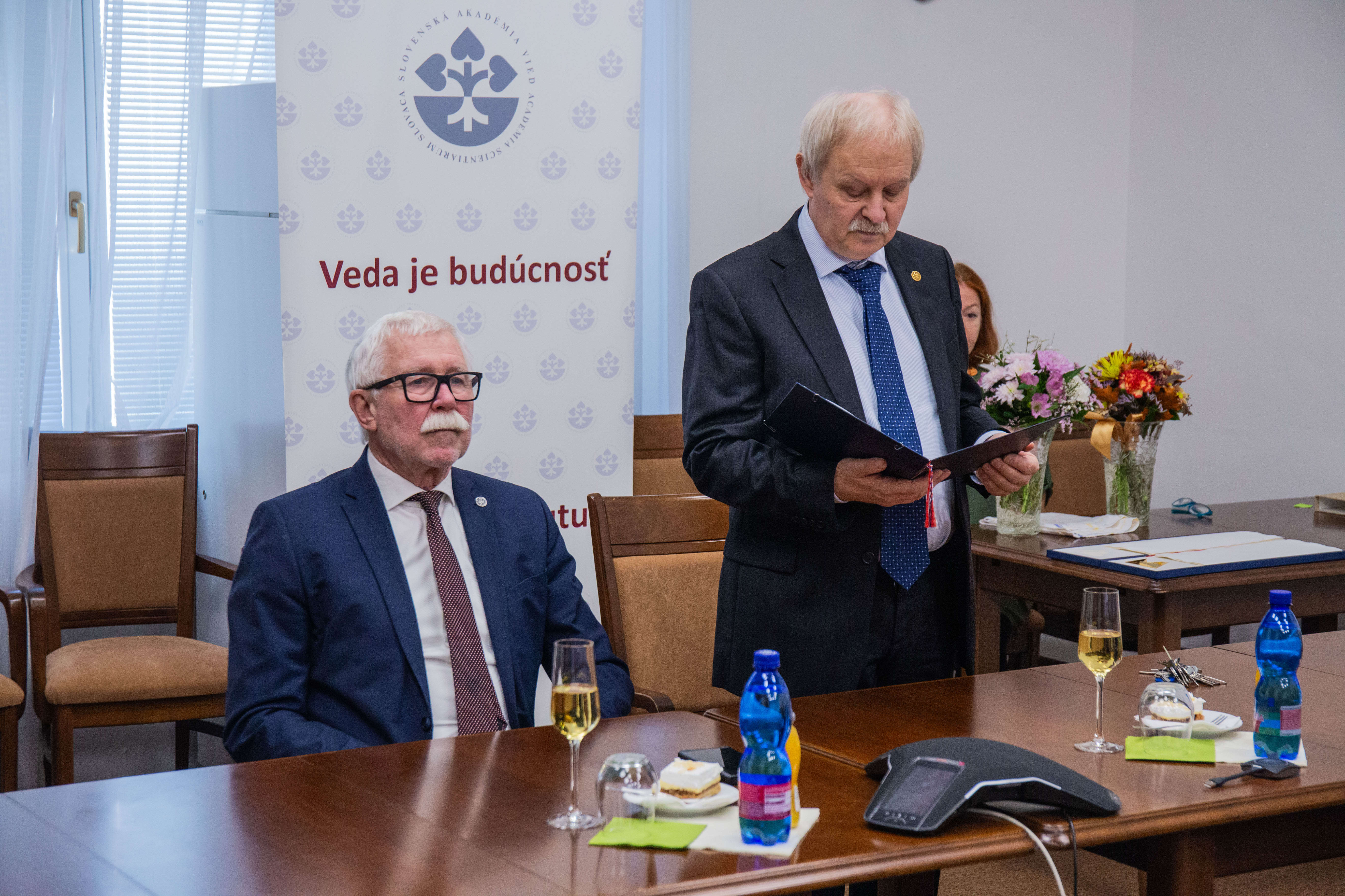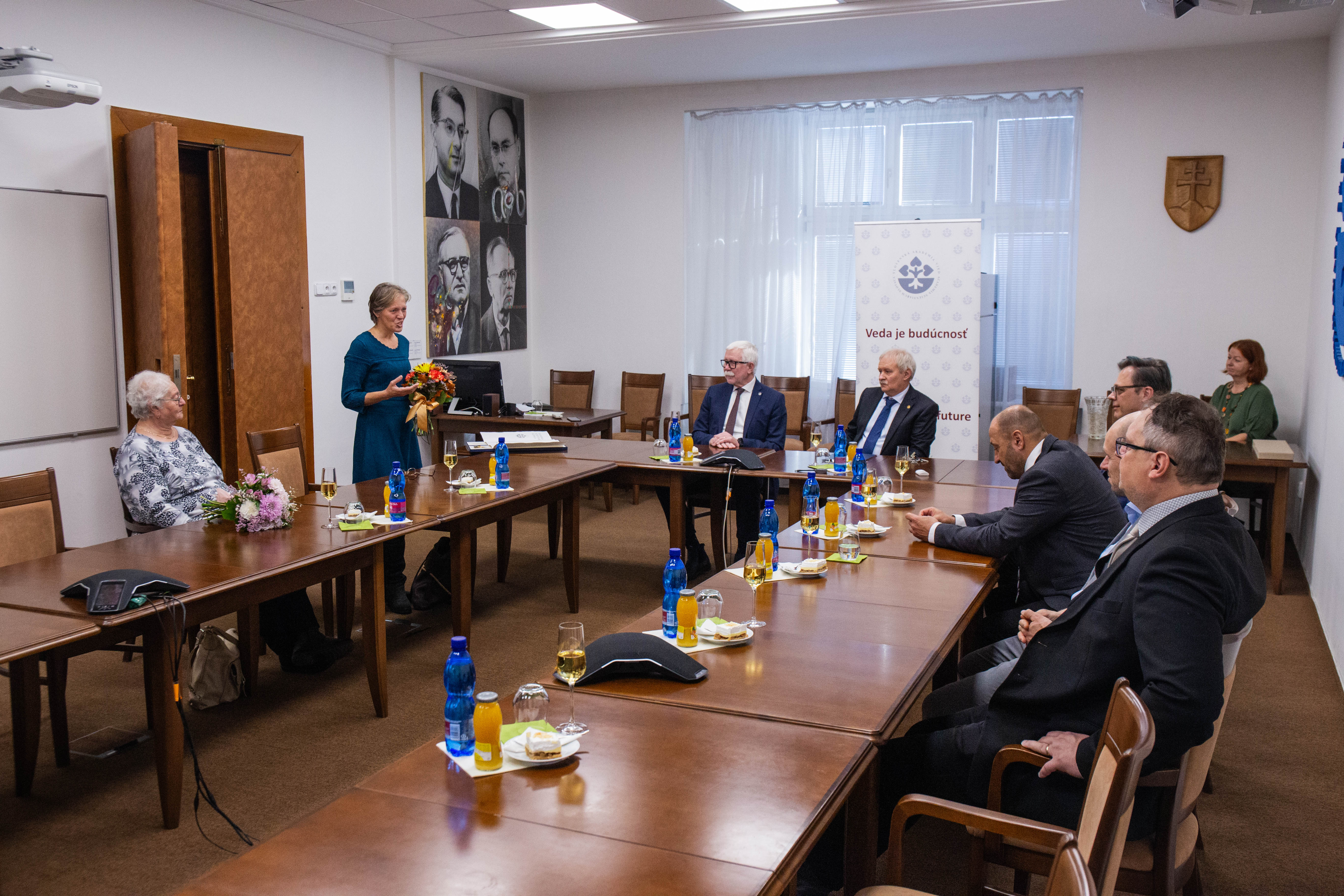 Na stretnutí boli prítomní aj podpredseda SAV pre II. oddelenie vied prof. Karol Marhold, člen predsedníctva SAV Tomáš Hromádka, riaditeľ Ústavu polymérov SAV, v. v. i., Jaroslav Mosnáček a kolegovia M. Omastovej Martin Danko a Matej Mičušík.