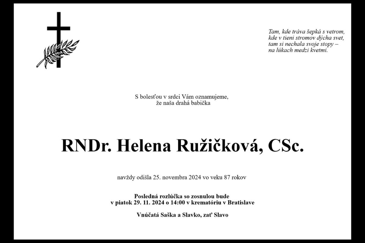 S ľútosťou oznamujeme, že 25. novembra 2024 zomrela vo veku 87 rokov RNDr. Helena Ružičková, CSc., slovenská botanička a dlhoročná pracovníčka Ústavu krajinnej ekológie SAV, v. v. i.