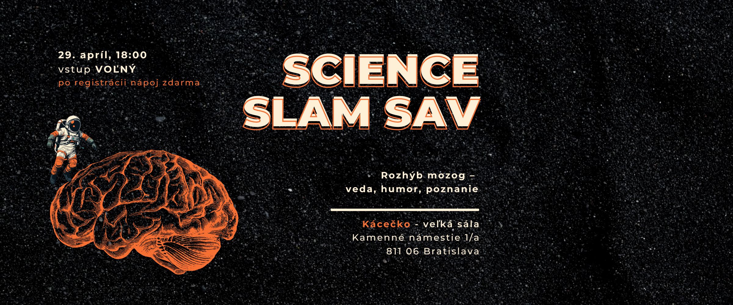 Po prestávke sa na Slovensko vracia svetovo obľúbené vedecké podujatie Science Slam. V utorok 29. apríla 2025 o 18.00 hod. sa vo Veľkej sále Kácečka v Bratislave postavia na pódium tri výskumníčky a traja výskumníci s jediným cieľom: ukázať, že aj veda môže byť zábavná, prístupná a fascinujúca. Vstup je voľný, potrebná je však REGISTRÁCIA