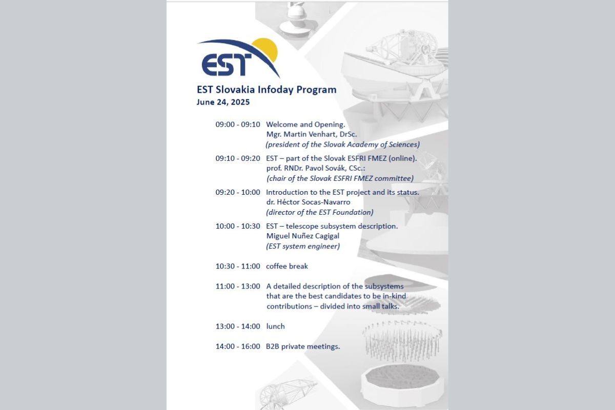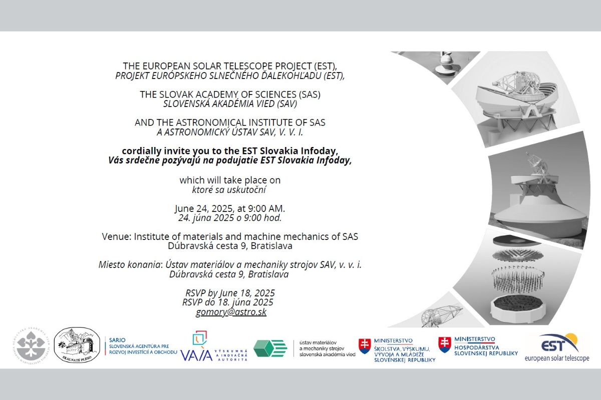 Slovenská akadémia vied a Astronomický ústav SAV, v. v. i., predstavia odbornej verejnosti európsky vedecký projekt – Európsky slnečný ďalekohľad (EST). Stane sa tak počas podujatia EST Slovakia Infoday, ktorý sa uskutoční 24. júna 2025 o 9.00 hod. na Ústave materiálov a mechaniky strojov SAV, v. v. i., v Bratislave. Cieľom podujatia je prepojiť kľúčových aktérov z priemyslu, výskumu a verejnej správy a otvoriť diskusiu o možnostiach zapojenia sa do tohto ambiciózneho paneurópskeho projektu.