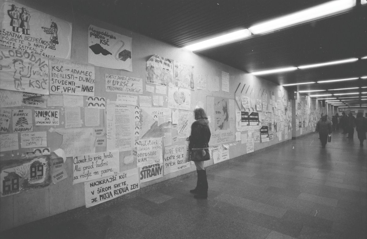 Nežná revolúcia v roku 1989 priniesla zásadnú vizuálnu zmenu československého verejného priestoru. Centrá miest prechádzali radikálnou premenou, manifestovanou v podobe plagátov, letákov a karikatúr, ktoré tvorili dominantnú vizuálnu vrstvu revolučných dní. Verejný priestor sa rýchlo stal platformou pre slobodné kolektívne vyjadrovanie. Objavovali sa tu vizuálne a textové odkazy, ktoré otvorene odsudzovali represívne zásahy Verejnej bezpečnosti a spochybňovali legitimitu vtedajšieho politického režimu.
