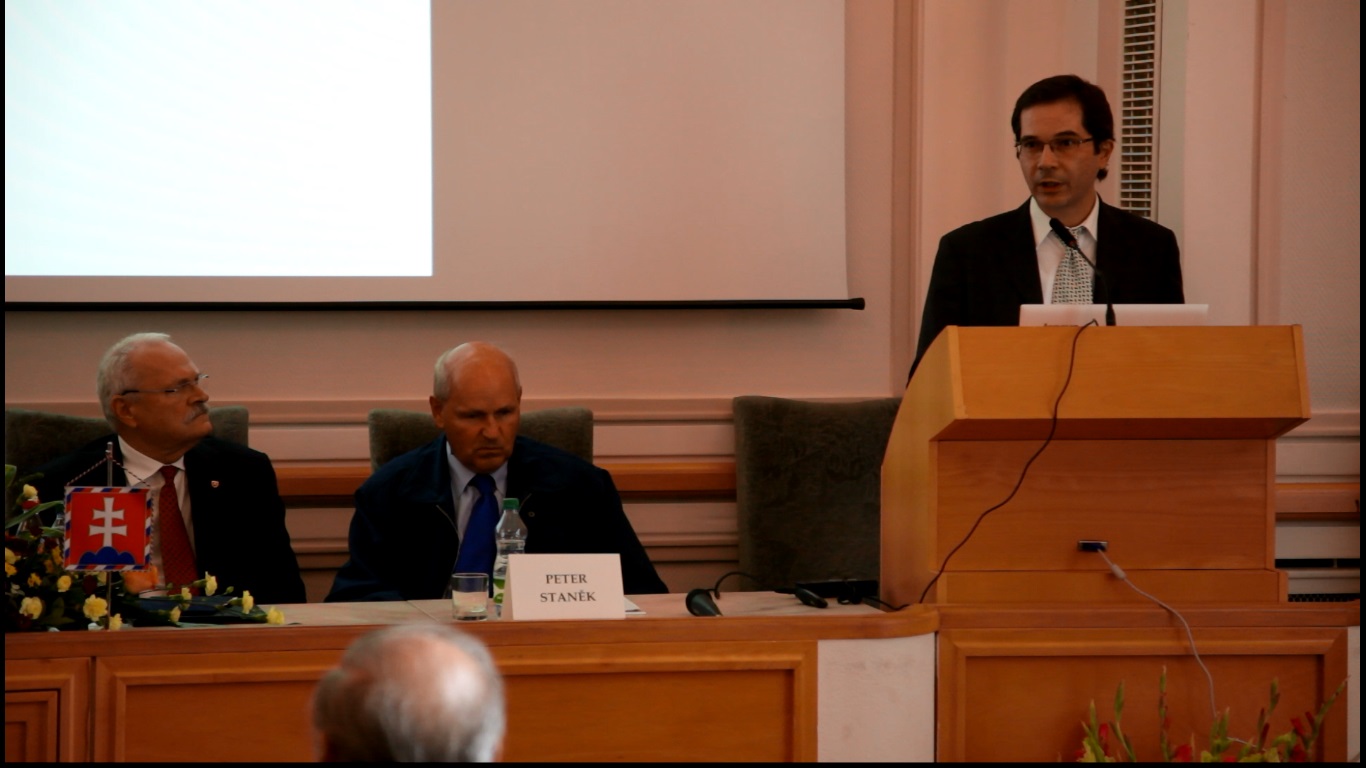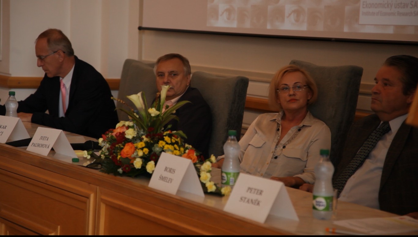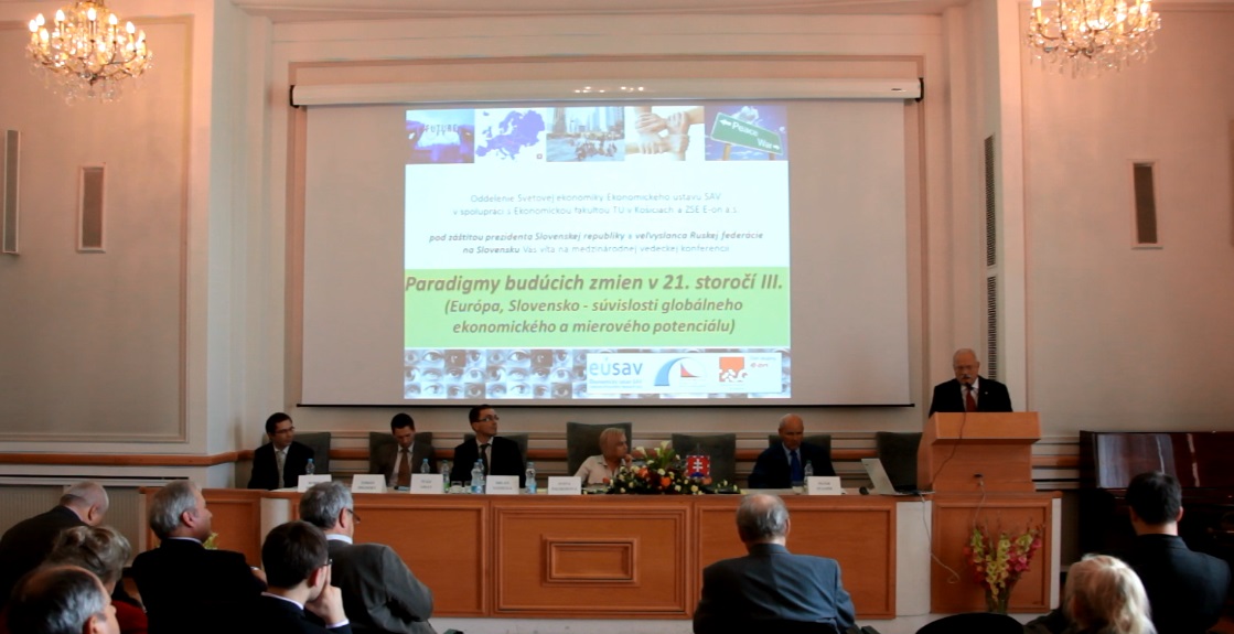 Slávnostné otvorenie plenárnej časti konferencie bolo v réžii doc. Ing. Ivety Pauhofovej, CSc. z Ekonomického ústavu SAV, ktorá bola gestorkou i hlavnou organizátorkou konferencie. Status quo v oblasti základných hrozieb globálneho vývoja, technologických zmien a vývoja globálnej spoločnosti počas krízy sugestívne predniesol spolugestor konferencie prof. Ing. Peter Staněk, CSc. z Ekonomického ústavu SAV. Súvislosti akútnej hrozby svetovej vojny vo väzbe na súčasné pnutie a konflikt v Sýrii a postavenie Ruska v rámci súčasných geopolitických zmien prezentoval vo svojom vystúpení „Vojna alebo mier: politické nástroje globálnych elít?“ prof. Dr. Boris Alexandrovič Šmelev, PhD. z Ekonomického ústavu Ruskej akadémie vied v Moskve. Otázky podstaty súčasného liberalizmu a jeho jednotlivých prejavov analyzoval politológ prof. PhDr. Oskar Krejčí, CSc. vo vystúpení „Liberální revoluce a globální vývoj“. Názory na stret civilizačných modelov cez optiku súčasných geopolitických a ekonomických zmien v krízovom období predniesla doc. Ing. Iveta Pauhofová, CSc. Základné determinanty vývoja vzťahu národnej a globálnej bezpečnosti boli súčasťou prezentácie prof. Dr. Štefana Volnera, CSc. z Vysokej školy ekonómie a manažmentu verejnej správy v Bratislave. Hosť z USA, Dr. Milan Vodička, prítomných zaujal svojim zamyslením sa nad Economic Well-Being – Question of Values? Problematika dlhovej krízy, tak analýzy samotných príčin, ako aj inštitucionálnej reakcie na krízu, bola obsahom prednášok Mgr. Ivana Lesaya, MA, PhD. a Ing. Borisa Hošoffa, PhD. z Ekonomického ústavu. Ing. Tomáš Želinský, PhD. z Ekonomickej fakulty Technickej univerzity v Košiciach vo svojom vystúpení „Príjmové nerovnosti a chudoba v období krízy“ strhol pozornosť účastníkov i samotného pána prezidenta prezentáciou súčasného stavu chudoby obyvateľstva na Slovensku na základe analýz individuálnych údajov Sociálnej poisťovne (v spolupráci s doc. Pauhofovou). Záverečné slovo prvého dňa konferencie patrilo prof. Staněkovi, ktorý sa zameral na akútne otázky pripravenosti EÚ na globálne výzvy. Po plenárnych vystúpeniach dopoludnia i popoludní nasledovali diskusie.