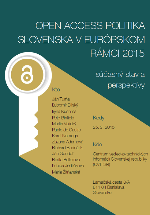 Medzinárodná konferencia s názvom Open Access politika Slovenska v Európskom rámci 2015 – súčasný stav a perspektívy, ktorá sa uskutoční 25. marca 2015 o 9.00 v Centre vedecko-technických informácií SR, Lamačská cesta 8/A, konferenčná miestnosť na 2.poschodí.