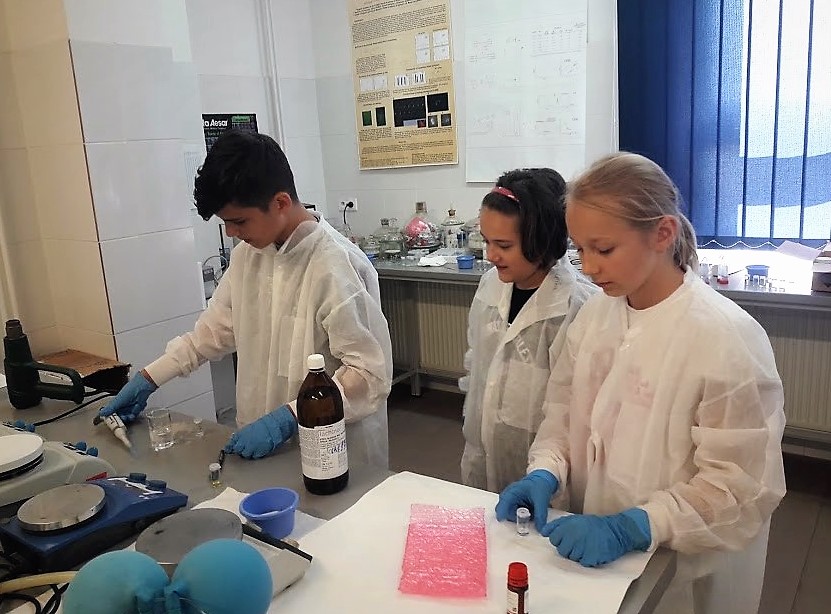 Na Ústave polymérov pracovali ďalší mladí vedci na príprave polymérnych nanočastíc pre medicínske účely. Ako nám žiaci sami vysvetlili, ich cieľom bolo pripraviť polymérne nanočastice s rôznymi liečivami. Pripravené častice ďalej skúmali pod mikroskopom a určovali ich veľkosť pomocou dynamického rozptylu svetla. Žiaci boli naozaj zaujatí množstvom nových poznatkov zo sveta chémie. Bolo pre nich ťažké zhodnotiť, ktorá skúsenosť bola najzaujímavejšia. Každého zaujalo niečo iné. Napríklad: „Mňa prekvapila taká hmota, ktorá, keď je v chladničke, je tekutá, a keď je v izbovej teplote, stuhne,“ vysvetľuje mladá výskumníčka Bibiana. Mladý vedec Timur zasa hovorí: „Mňa zaujalo zloženie grafénu.“ Na otázku, či prídu aj budúci rok, všetci traja odpovedajú kladne. Na Ústave polymérov pracovali pod náročným dohľadom Mgr. Anny Zahoranovej, PhD. Na realizácii pomáhali aj Mgr. Mária Kováčová, Ing. Róbert Balogh a Ing. Peter Čakánek.